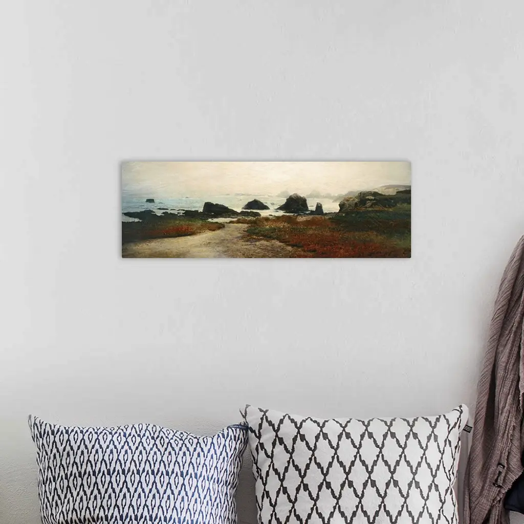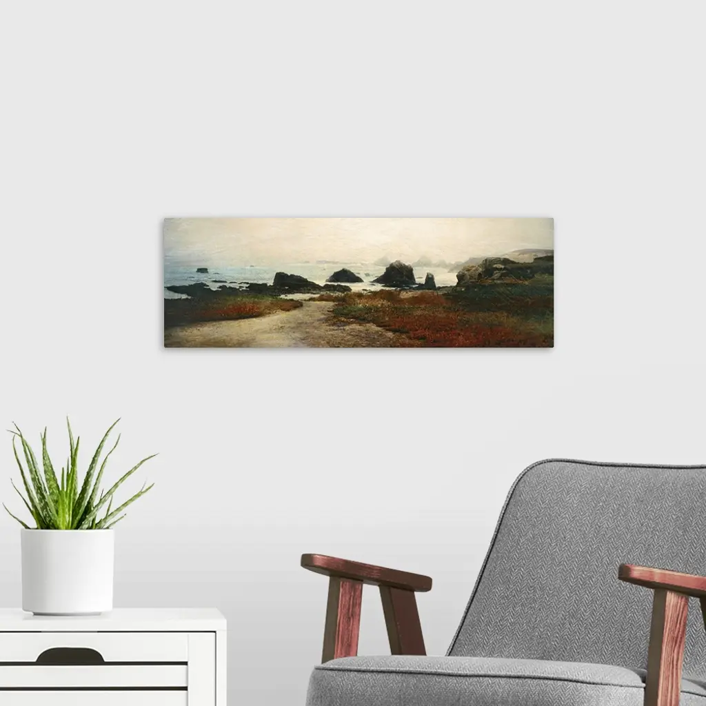 Panoramic photograph displays patches of grass and sand on the edge of a rocky shoreline that has a few giant rock formations leading into the water. Artist adds brush strokes over the entire piece to add a layer of depth to this photograph.