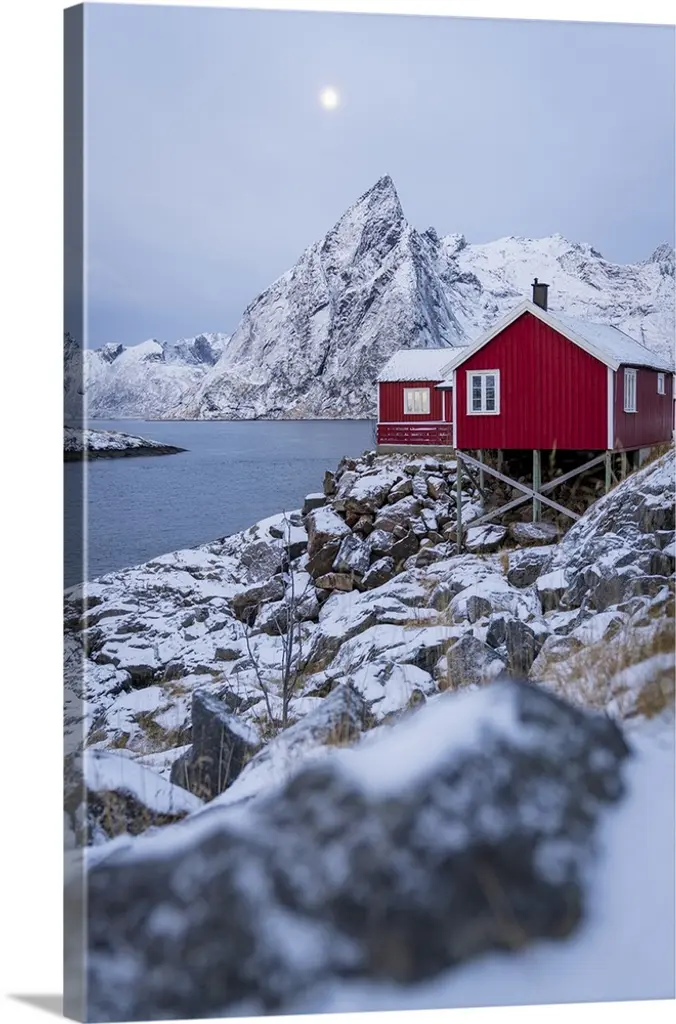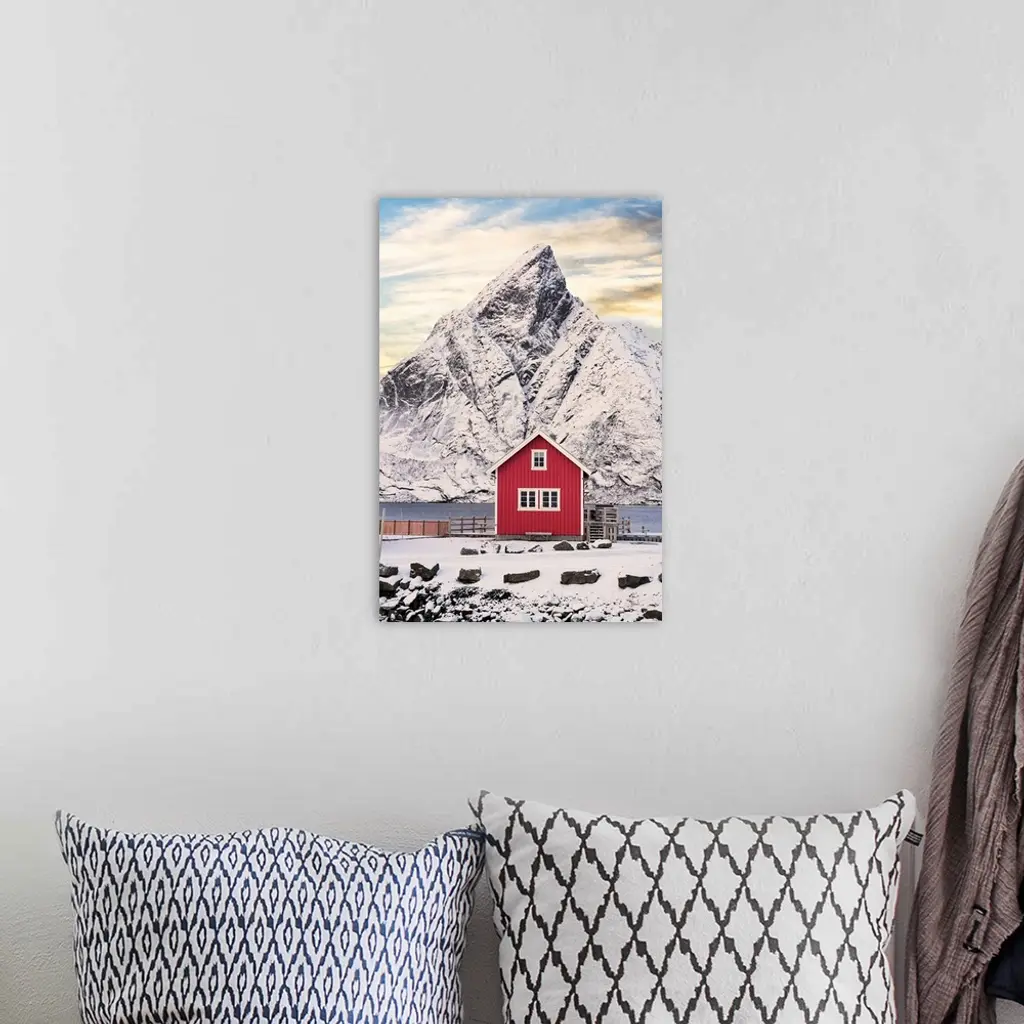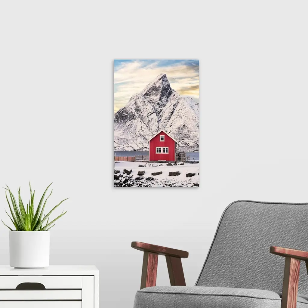 Isolated Red Fisherman Cabin With Snowcapped Mountain, Lofoten Islands, Norway