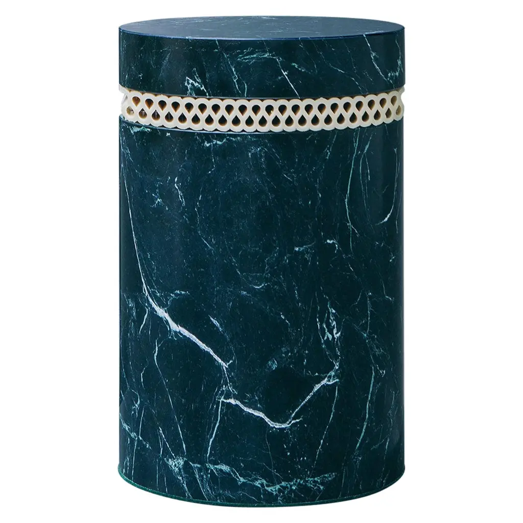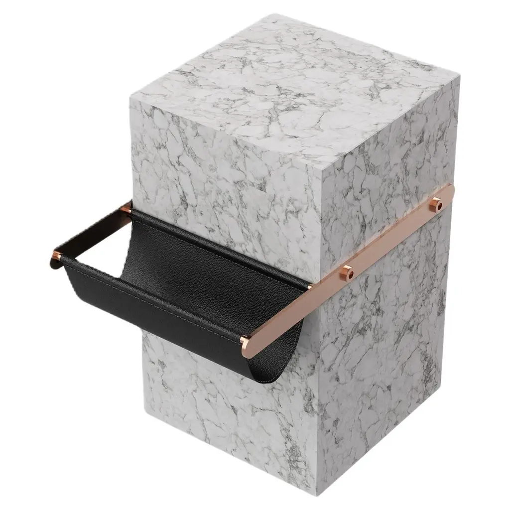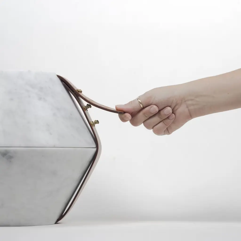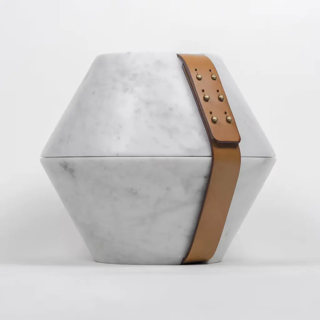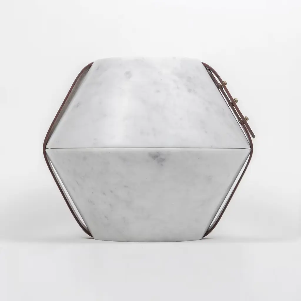 This elegant container in white Carrara marble has been worked on a lathe and its shape evokes the one of an hourglass. To safely store memories and unique objects, the two lids of the container are secured with a genuine leather strap.