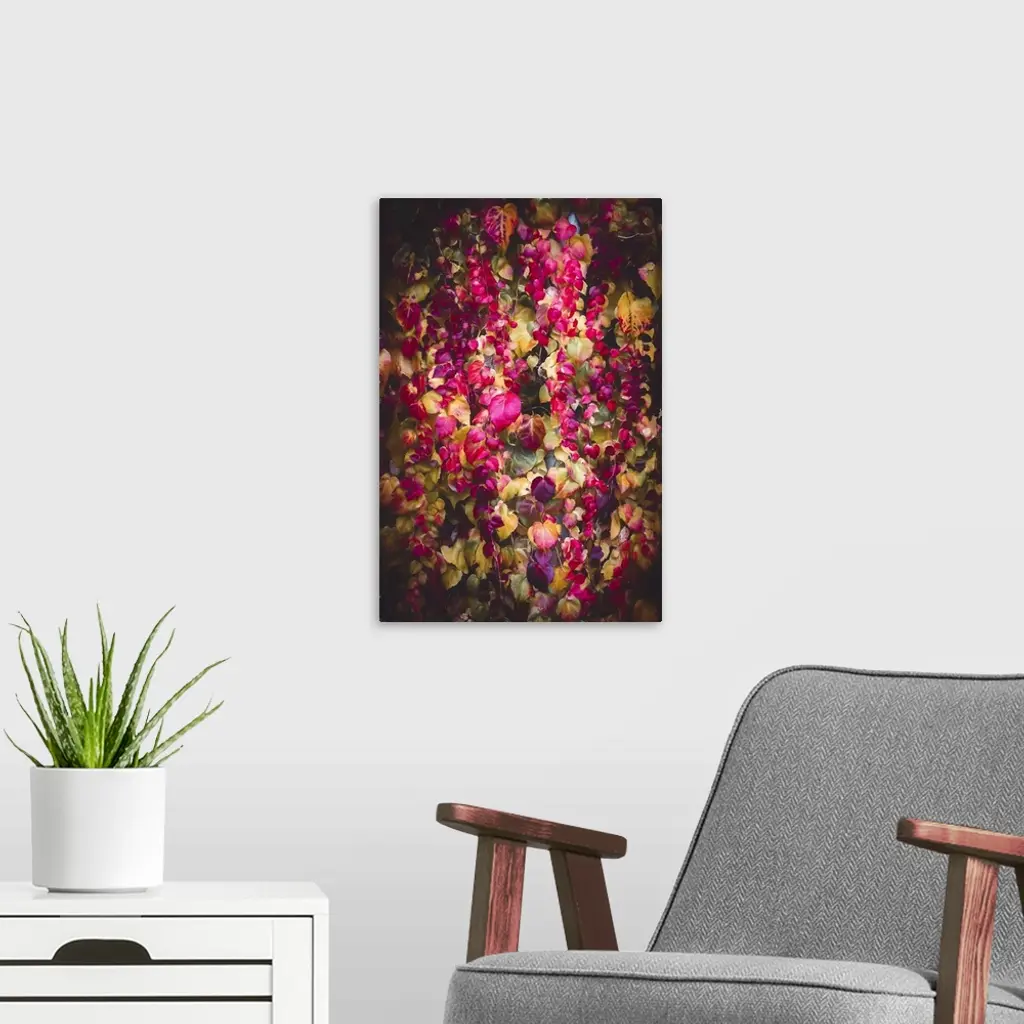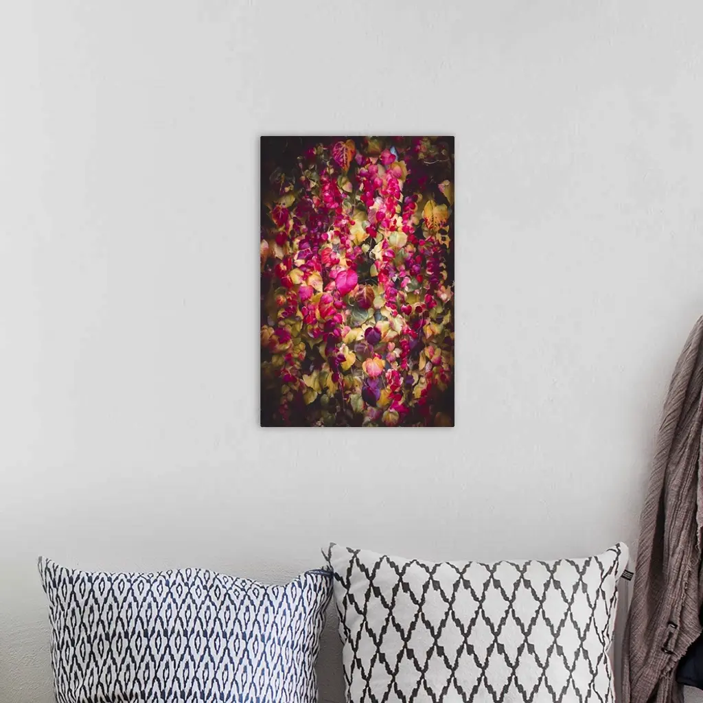 Vibrant foliage in a kaleidoscope of colors, including shades of pink, purple, and green, creates a lush, cascading effect. The play of light and shadow enhances the depth and richness of the leaves, suggesting a sense of movement and life.