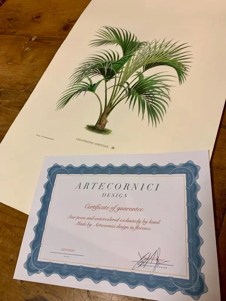 One of six hands watercolored and press printed botanical print.Each print is entirely printed and colored in Italy by our master craftsmen.The complete set can be viewed on our page and they are also available with a black wooden frame.From this series:- Kentia Luciani- Mapania Lucida- L'Illustration Horticole- Calamus Lindeni- Thrinax Graminifolia- Codiaeum Pictuminternal meausurements print 30 cmx 37 cmWith an experience of over 40 years, Artecornici design creates high-quality handmade frames using precious woods and working various types of high-quality finishes, lacquers and ageing, offering a vast choice of models.Each print is an artisanal Florentine product, reproducing images of the European 18th and 19th centuries with the same printing techniques (engraving with a star press), the golden age of prints, which are then finished and watercolored exclusively by handThe richness of our work lies in the ability to make our customers' requests our own, creating products with personalized, unique and precious creations, renewing our collections year after year.