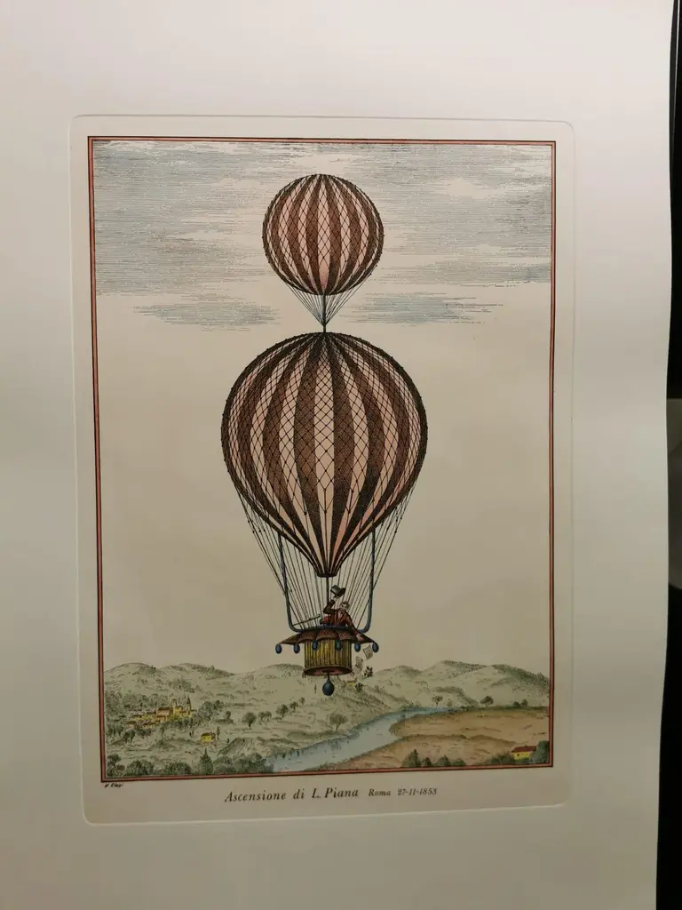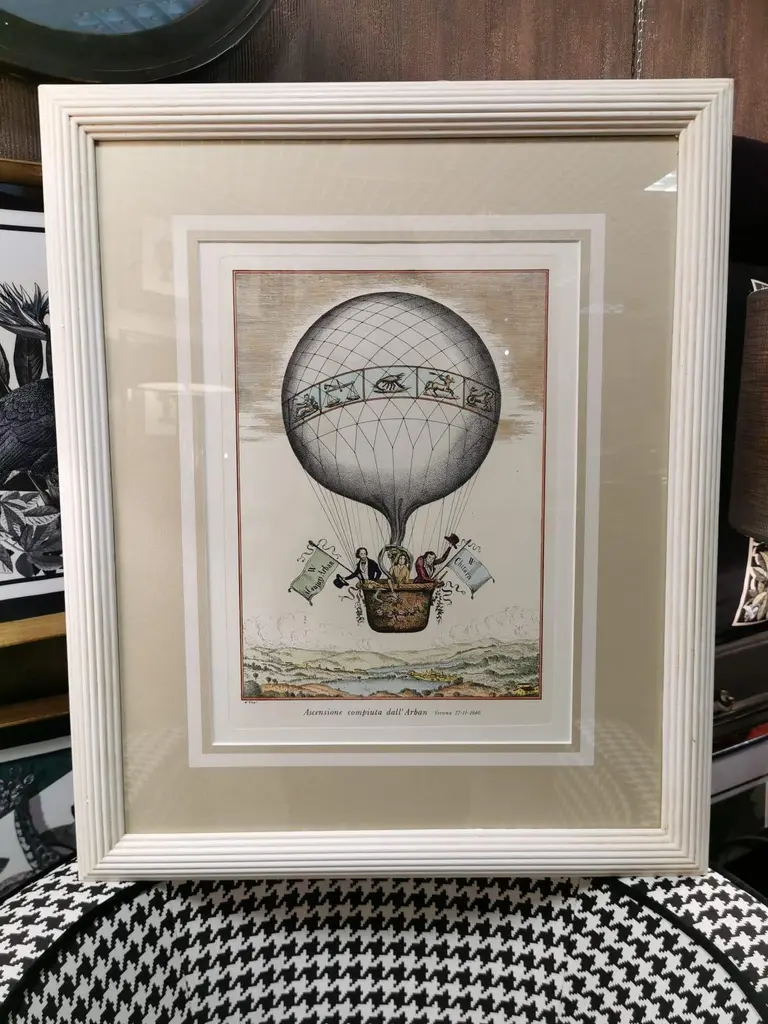 Funny and elegant press print made in Italy, representing a hot-air balloon, hand-colored by skilled Florentine artisans, hand-coated white frame.This print is combined with others of the same series.The entire collection can be viewed on our pageWith an experience of over 40 years, Artecornici design create high quality handmade frames using precious woods and working various types of high quality finishes, lacquers and aging, offering a vast choice of models.Each print is an artisanal Florentine product, reproducing images of the European 18th and 19th centuries with the same printing techniques (engraving with a star press), the golden age of prints, which are then finished and watercolored exclusively by handThe richness of our work lies in the ability to make our customers' requests our own, creating products with personalized, unique and precious creations, renewing our collections year after year.