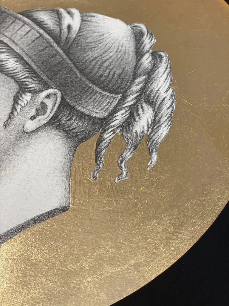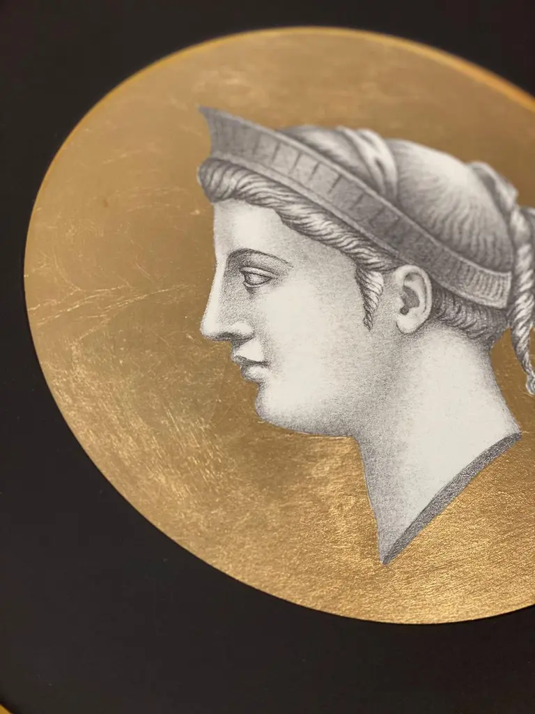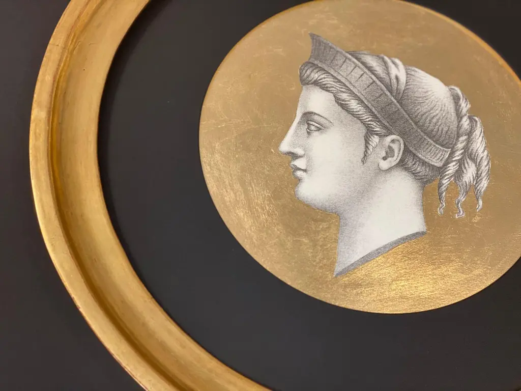 Italian Contemporary Print Of Ancient Profile With Round Gold Wooden Frame