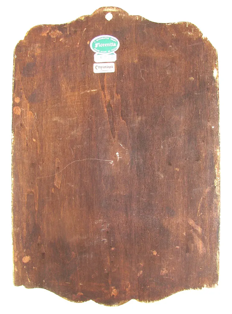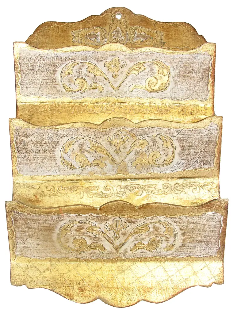 Italian wall mounted letter box / mail sorter finished with gold leaf and painted in gold and white of the Florentine style. Perfect in entry for collecting incoming mail. Ready to hand with an integral hole at the top. Marked en verso with the fabricator's label "Florentia, Hand Made in Italy" and the boutique label "Christine's, Kansas City". Very good vintage condition with minimal wear on front, surface wear on back which is not visible when in use.