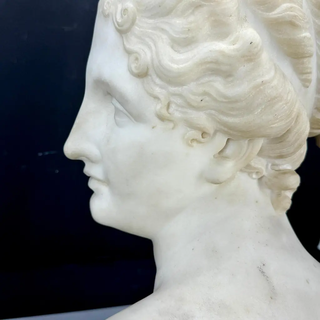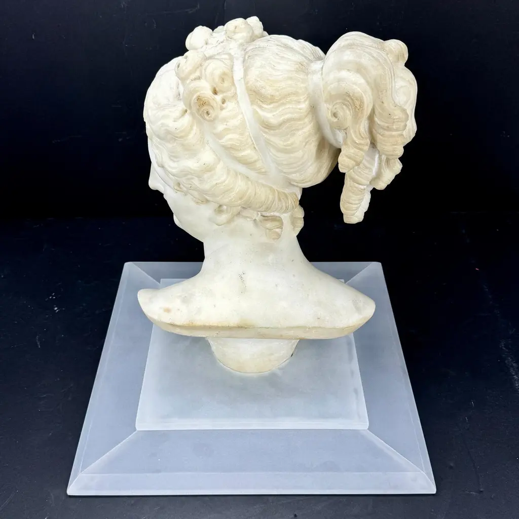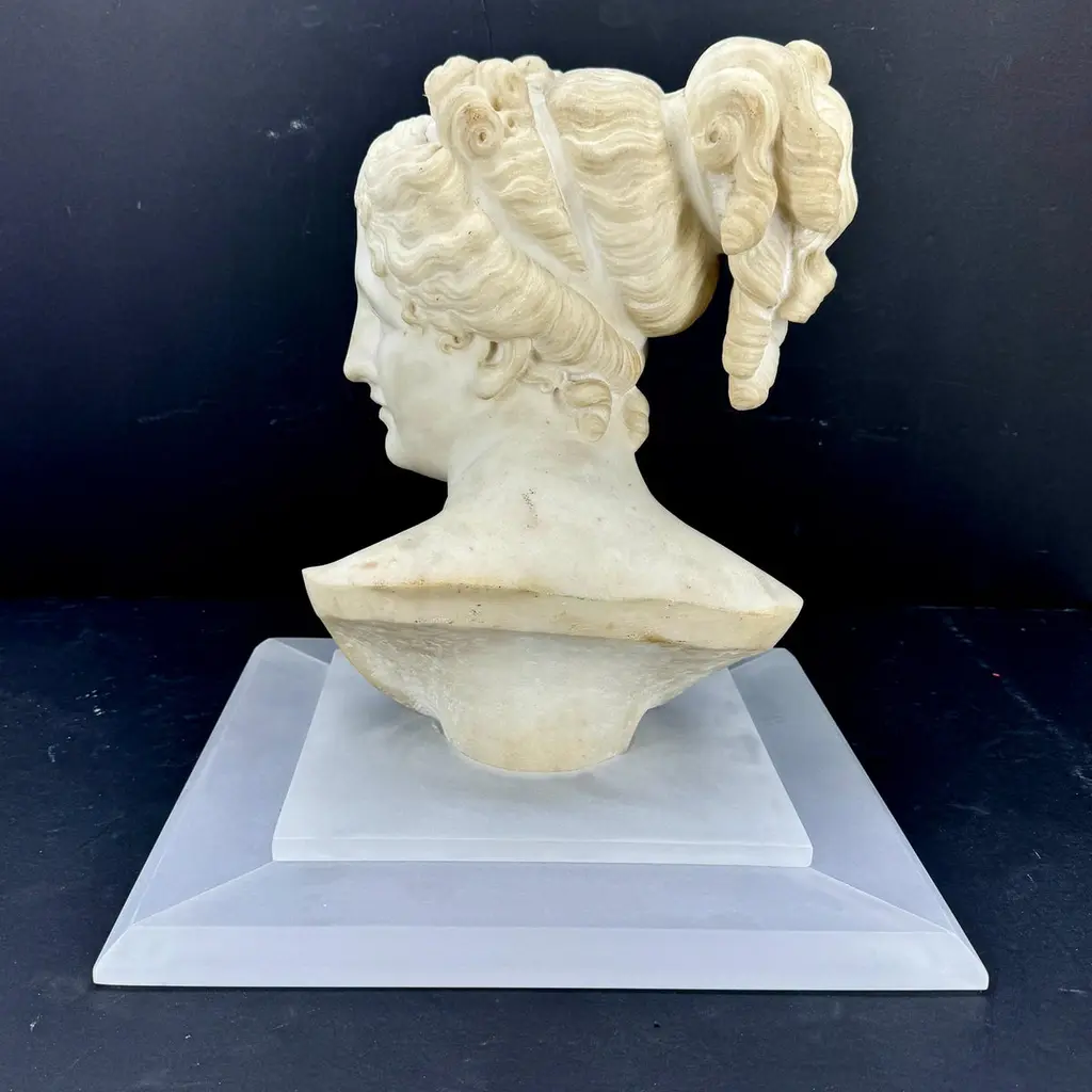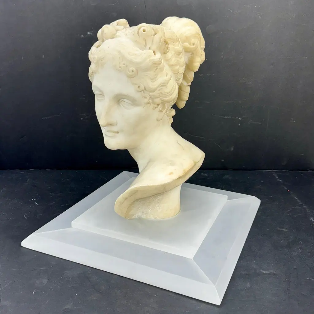 An exquisite marble bust from the early 19th Century portraying a female figure. A true testament to the craftsmanship of after Antonio Canova of Italy. This piece stands atop a 2 tiered frosted lucite base, making it a stunning focal point for any space. Beautifully carved from marble, note all the intricate detailing around her head. This bust is a remarkable piece of artistry that brings a touch of history to your décor.