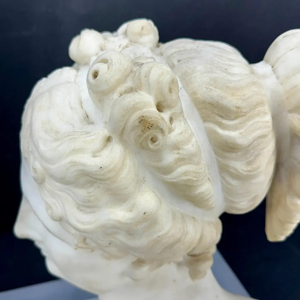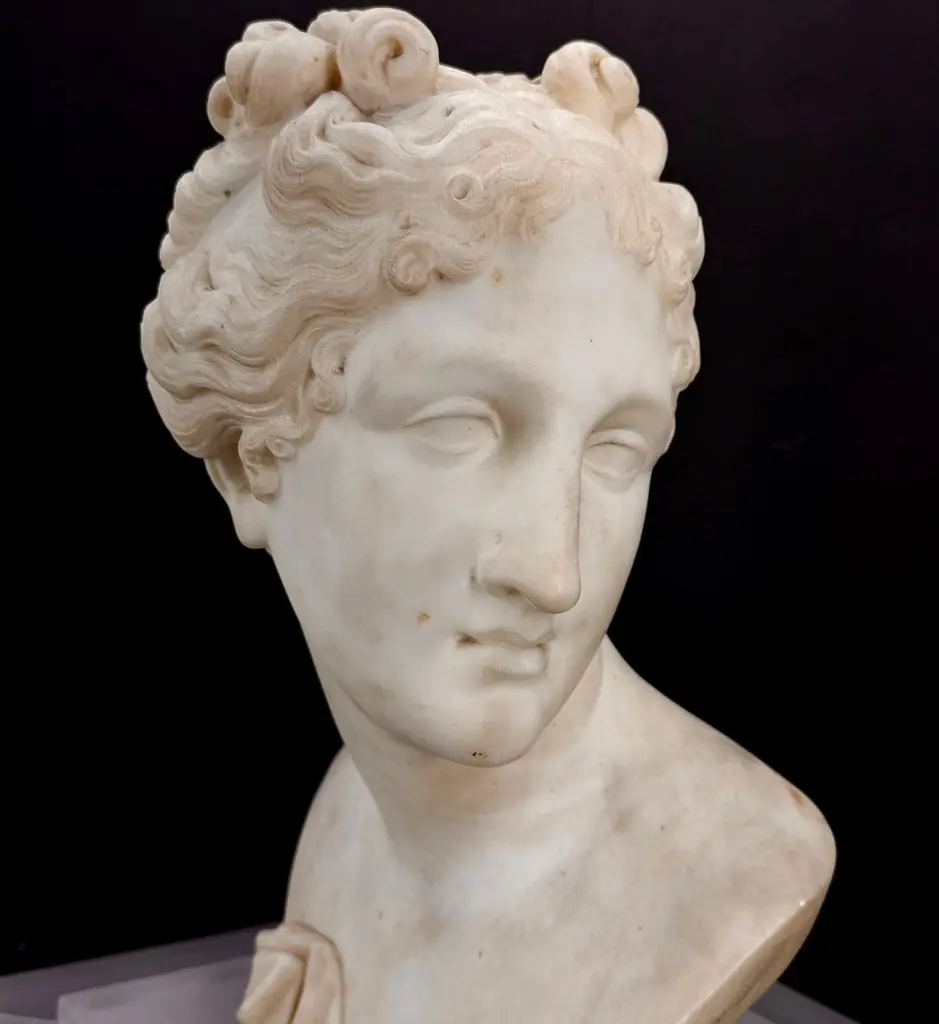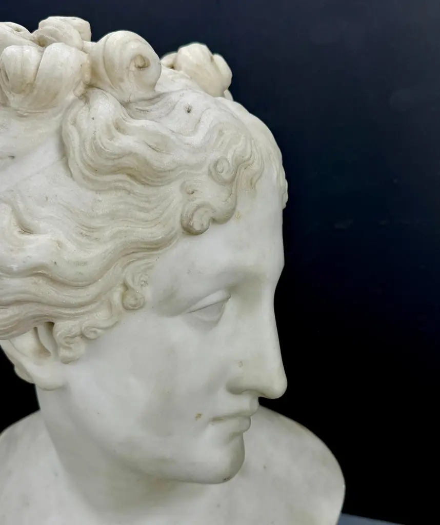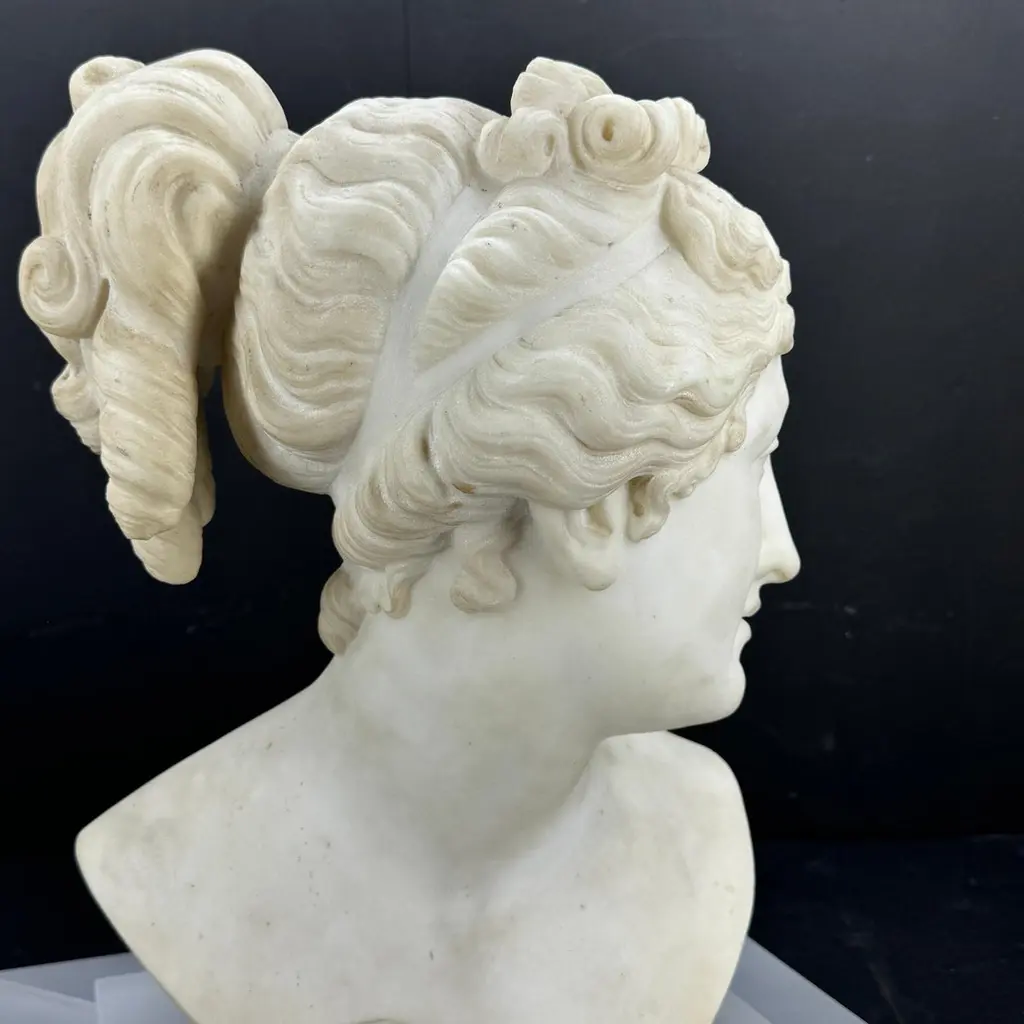 An exquisite marble bust from the early 19th Century portraying a female figure. A true testament to the craftsmanship of after Antonio Canova of Italy. This piece stands atop a 2 tiered frosted lucite base, making it a stunning focal point for any space. Beautifully carved from marble, note all the intricate detailing around her head. This bust is a remarkable piece of artistry that brings a touch of history to your décor.