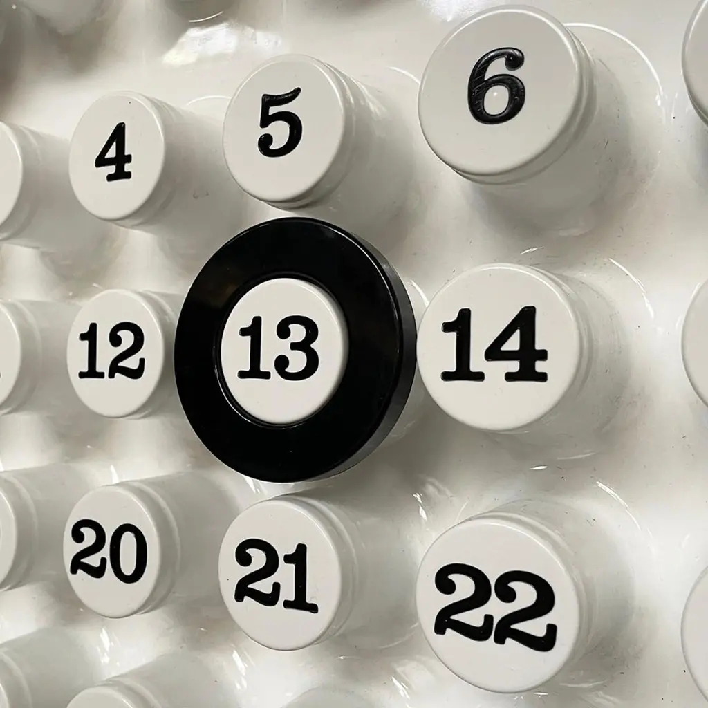 Italian postmodern Wall perpetual white calendar by Giorgio Della Beffa for Ring A Date, 2000-2010sWall perpetual calendar in white plastic. The calendar has several protruding cylinders: these correspond to the days of the week in the upper part, to the numbers in the central part and to the months in the lower part. It is possible to mark the days and months thanks to a black plastic ring. The ring can be requested in other colors.Produced by Ring A Date in 2000-2010s and designed by Giorgio Della Beffa in 1970s. Nameplate present on the side.Excellent conditions, perfectly preserved.Measurements in cm 47.5x6x47.5hThe calendar is also present in yellow, orange and green.This calendar is suitable both for a formal place such as an office or a waiting room, and for an informal place such as a bedroom, a living room, a dining room or an entrance hall.