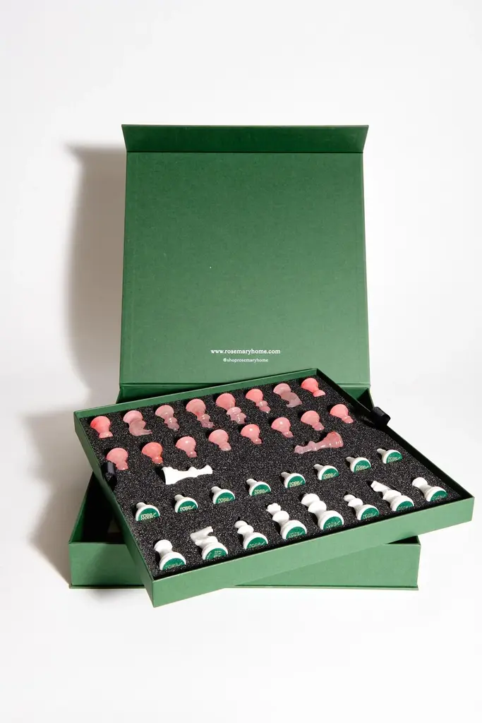 Skilled artisans carved this luxury chess set from Italian Alabaster, a natural stone native to Volterra, Italy. Alabaster has a unique vein pattern so the colors may vary. Each chess set features two extra queens. Please treat with care and keep out of direct sunlight. Clean with a damp cloth. Avoid all contact with harsh chemicals and acidic substances, such as wine, vinegar, and citrus. Each chess set comes with a luxury keep box produced in England.