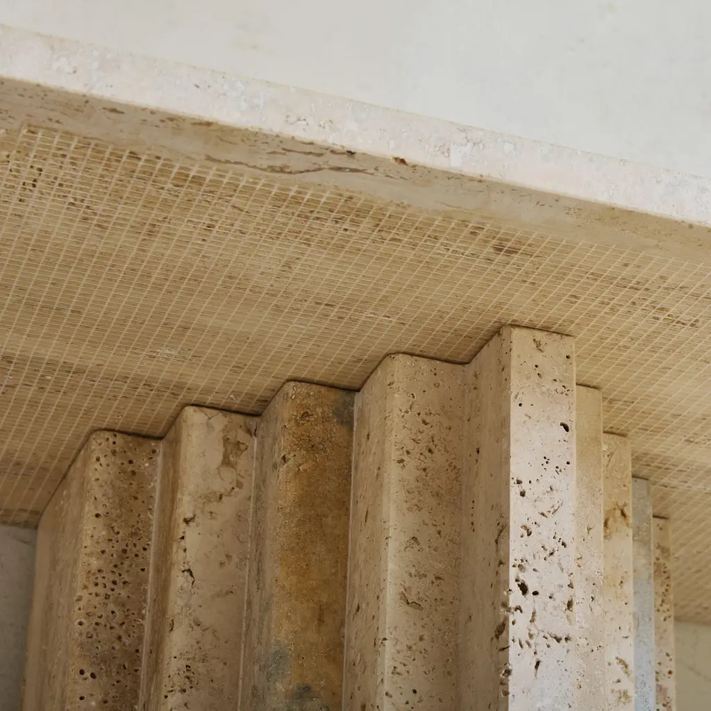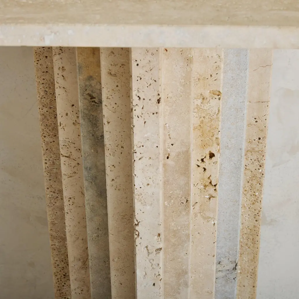 Sold and priced individually.This 1970s Italian travertine console embodies the sculptural ethos of Carlo Scarpa. The monolithic fluted base, with its rhythmic, stepped detailing, recalls Scarpa’s signature approach—where classical forms meet modernist precision.The floating travertine top, featuring a distinct cutout detail, enhances the interplay of negative space and asymmetry, creating a dynamic yet harmonious silhouette. The natural veining and porous texture of the stone further enrich the console’s organic materiality, making it a statement piece that feels both timeless and monumental. Condition: In great vintage condition, with one minor chip on the base of one console. The top is not affixed to the base.