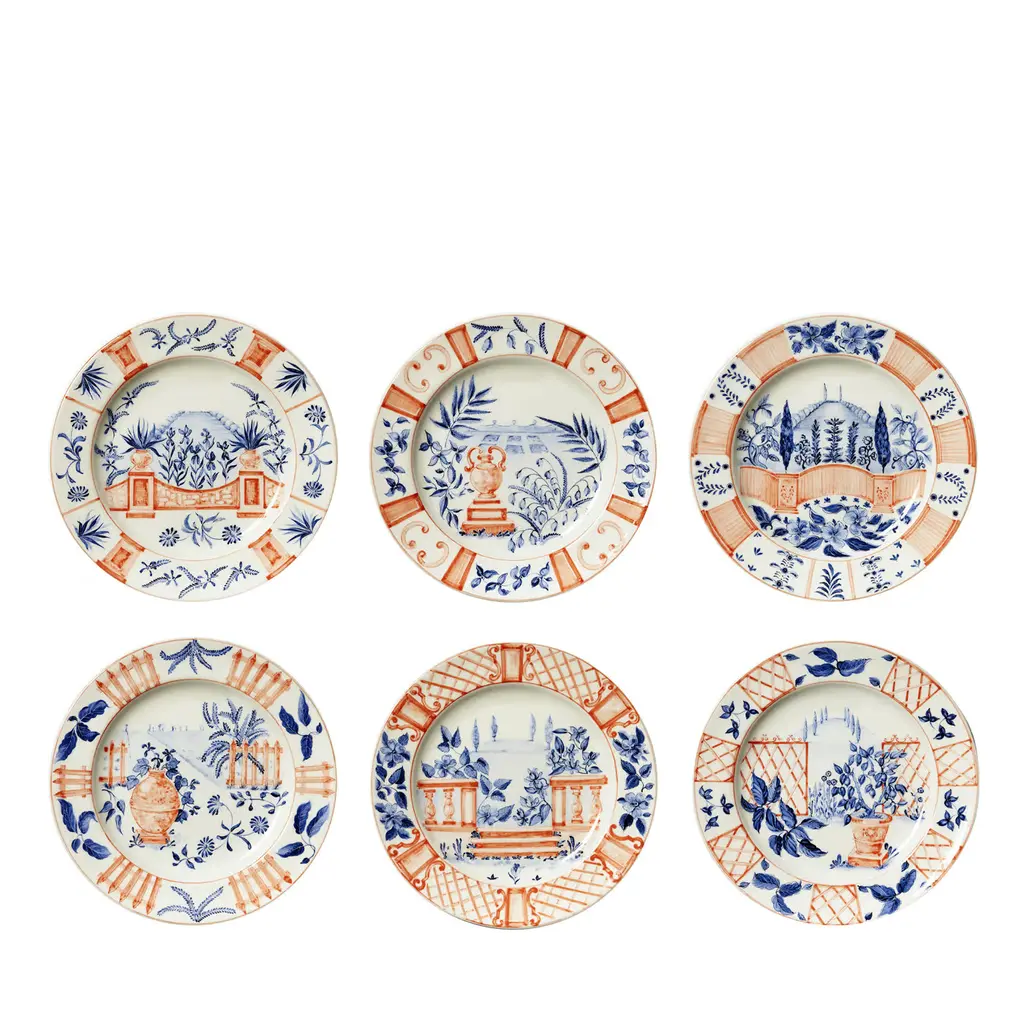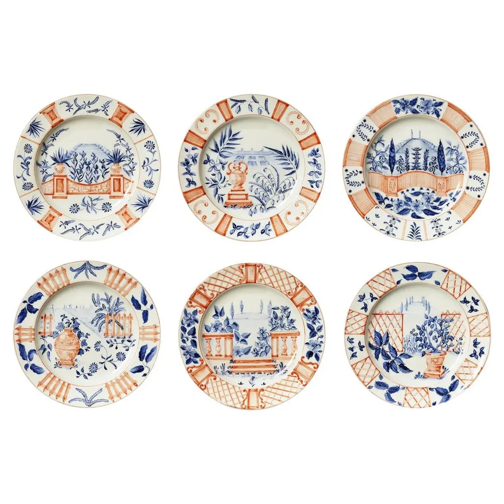 A dinner set composed of 6 ceramic dishes with 6 different typical and classic Italian views, painted in red and blue shades. Every item of the set is unique and entirely hand-made by craftsmen with decades of experience. They are 100% made in Italy, don't put them in the oven or the microwave.