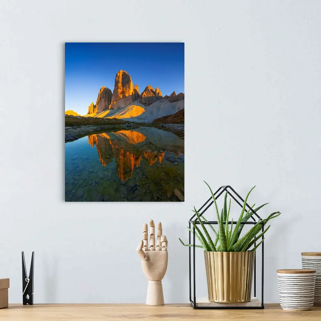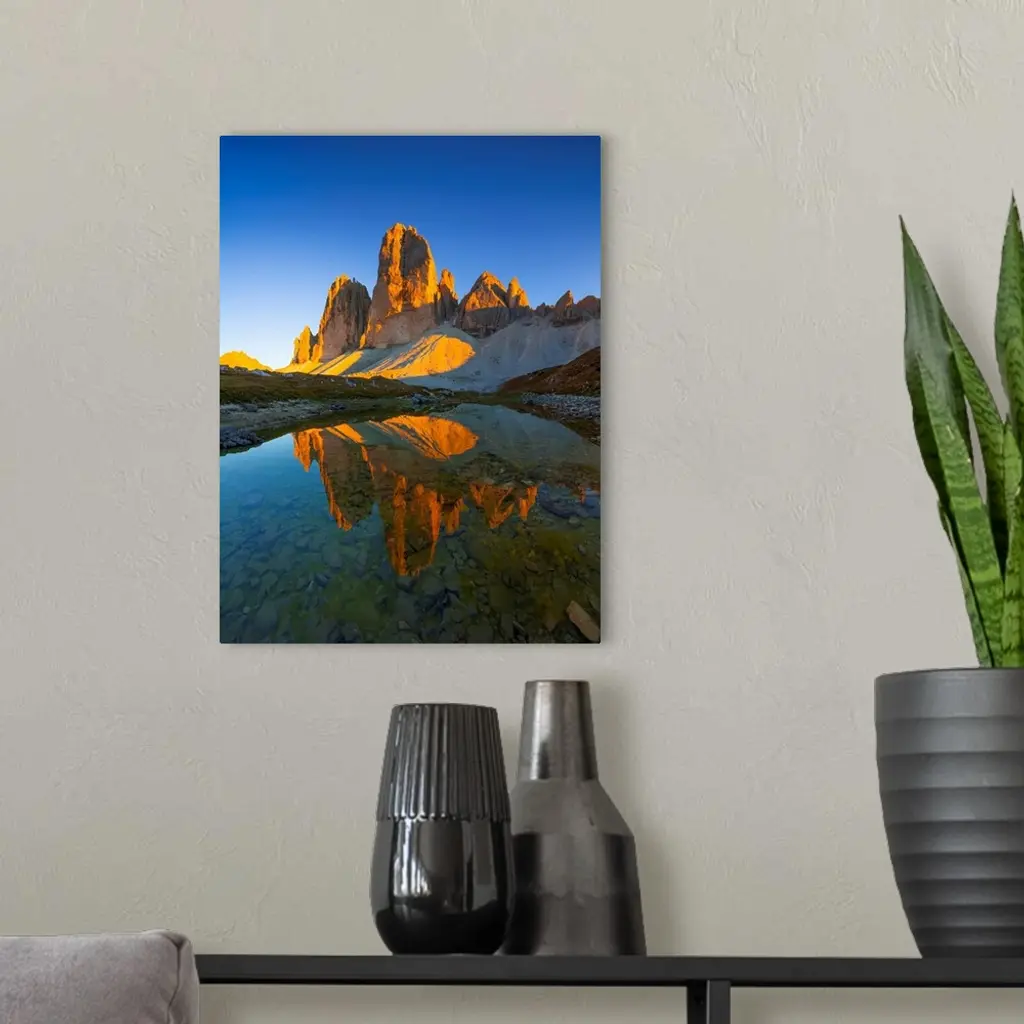 Italy, Alps, Dolomites, South Tyrol, Tre Cime Di Lavaredo And Grava Longa Lakes, Evening