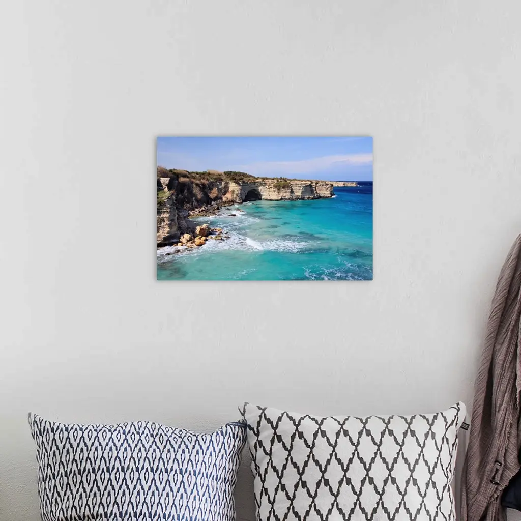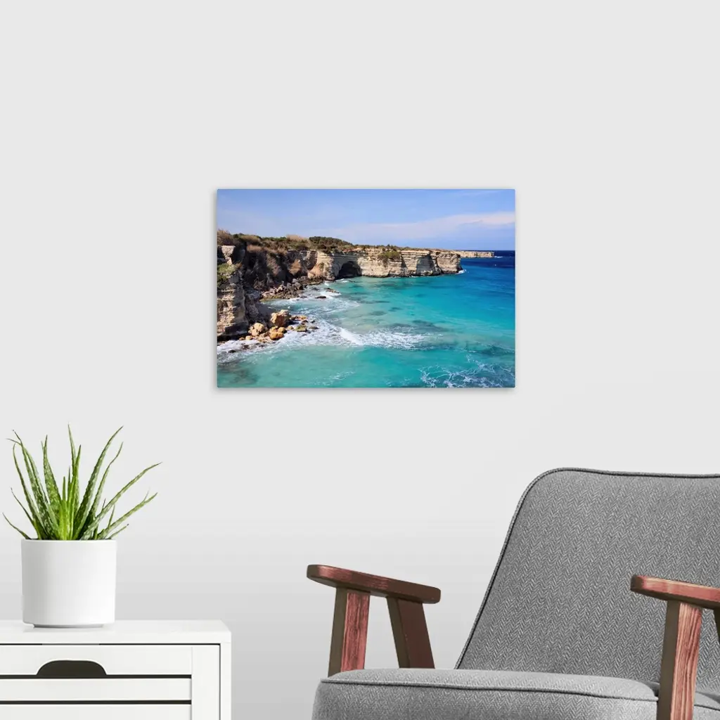 Italy, Apulia, Otranto, Coastal landscape with the white cliffs at Baia dei Turchi wall art for home and office decor. Discover canvas art prints, photos, mural, big canvas art and framed wall art in GreatBigCanvas.com's varied collections.