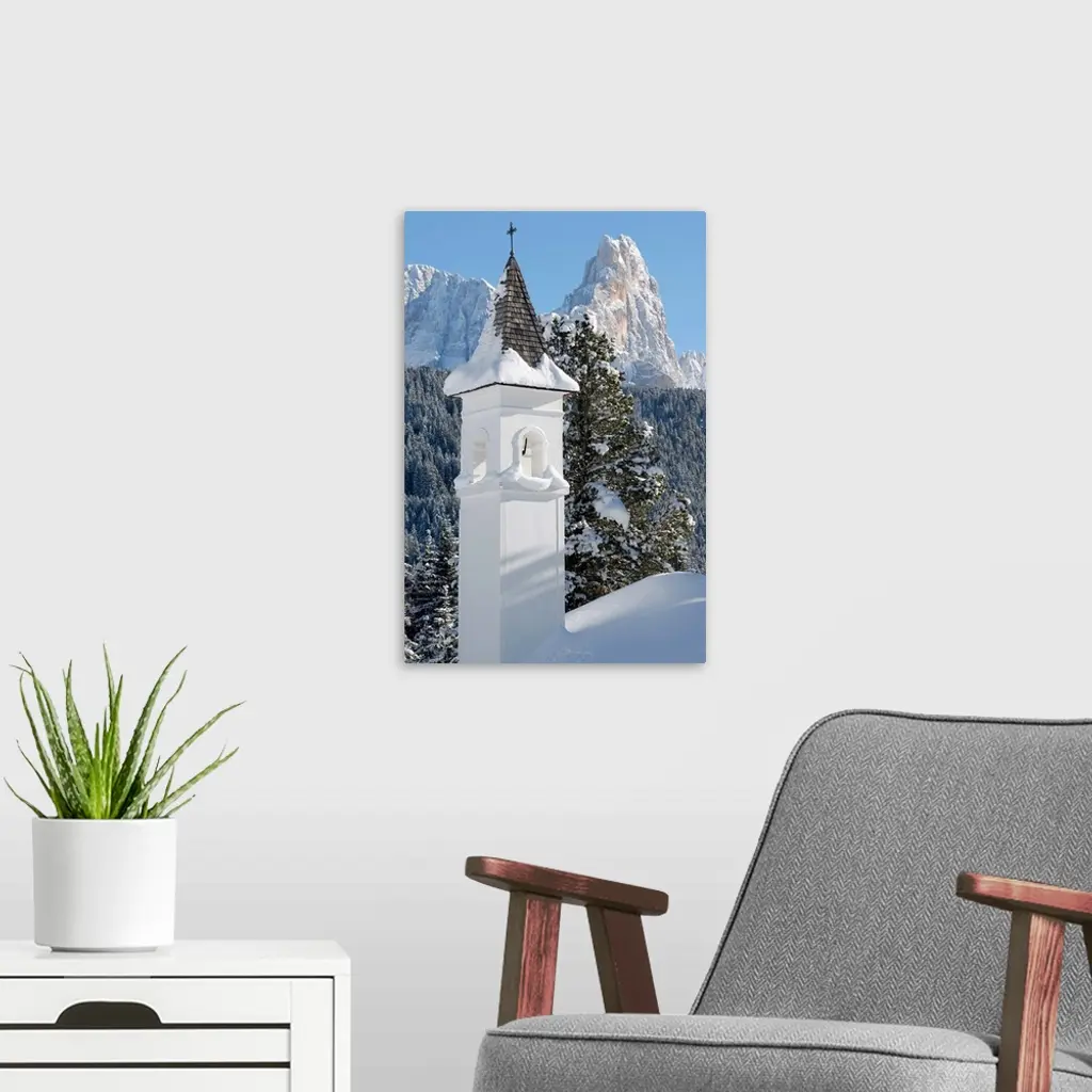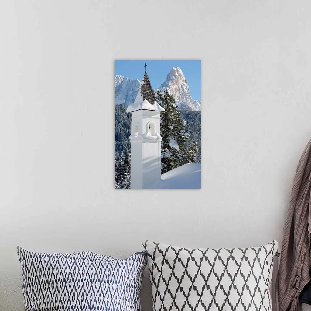 Italy, Dolomites, church and Pale di San Martino range in background wall art for home and office decor. Discover canvas art prints, photos, mural, big canvas art and framed wall art in GreatBigCanvas.com's varied collections.
