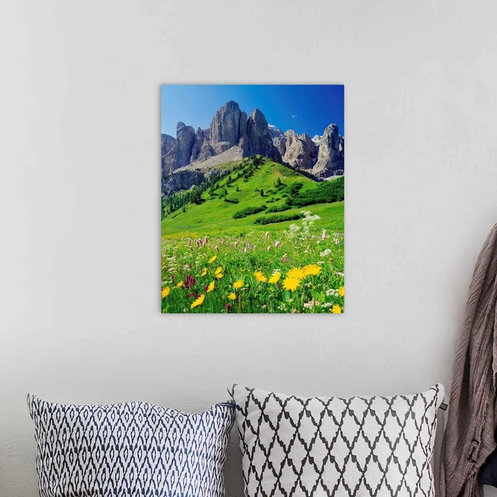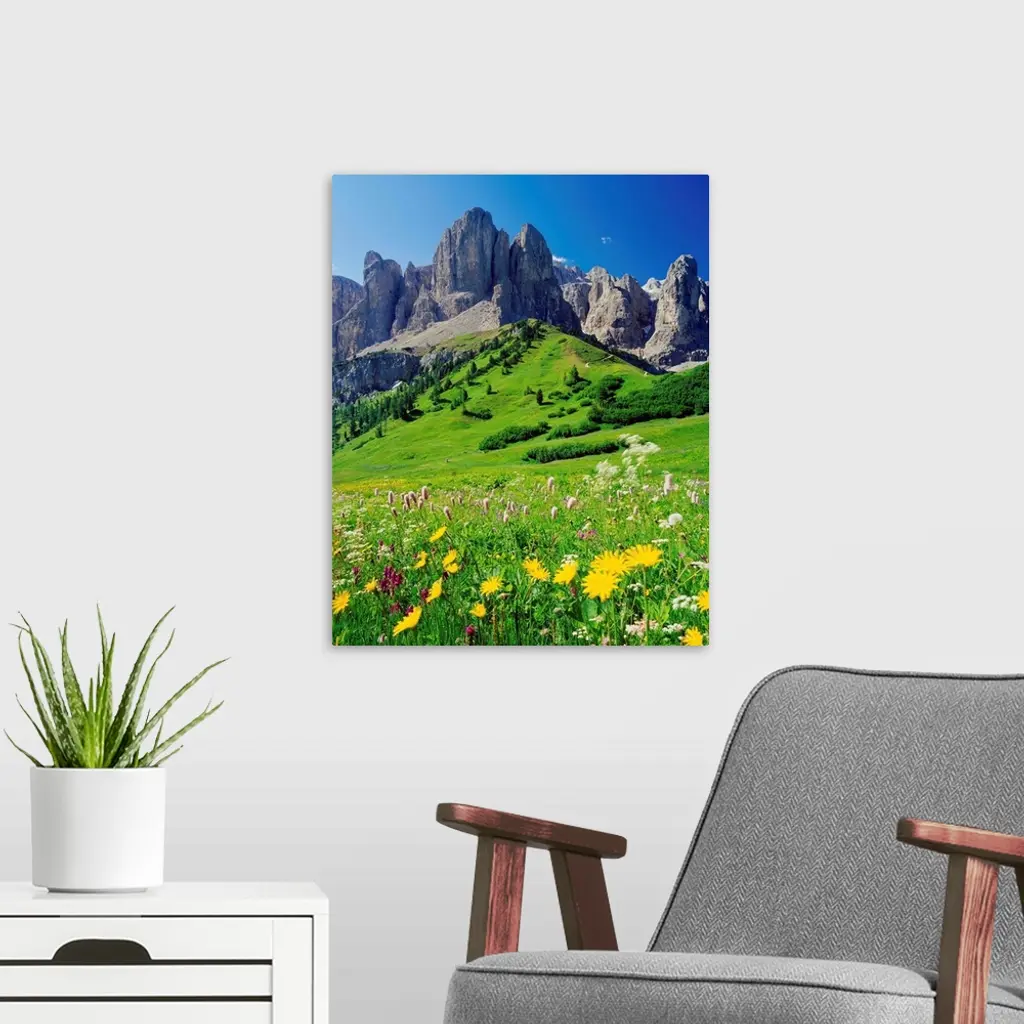 Italy, Dolomites, Passo Gardena (Grodner Joch), alpine meadow towards Sella wall art for home and office decor. Discover canvas art prints, photos, mural, big canvas art and framed wall art in GreatBigCanvas.com's varied collections.