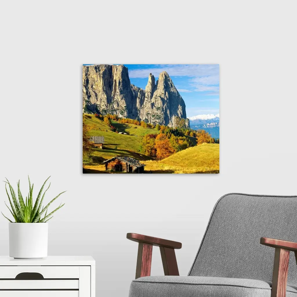 Italy, Dolomites, Swiss Alps (Seiser Alm), view towards Sciliar (Schlern) wall art for home and office decor. Discover canvas art prints, photos, mural, big canvas art and framed wall art in GreatBigCanvas.com's varied collections.