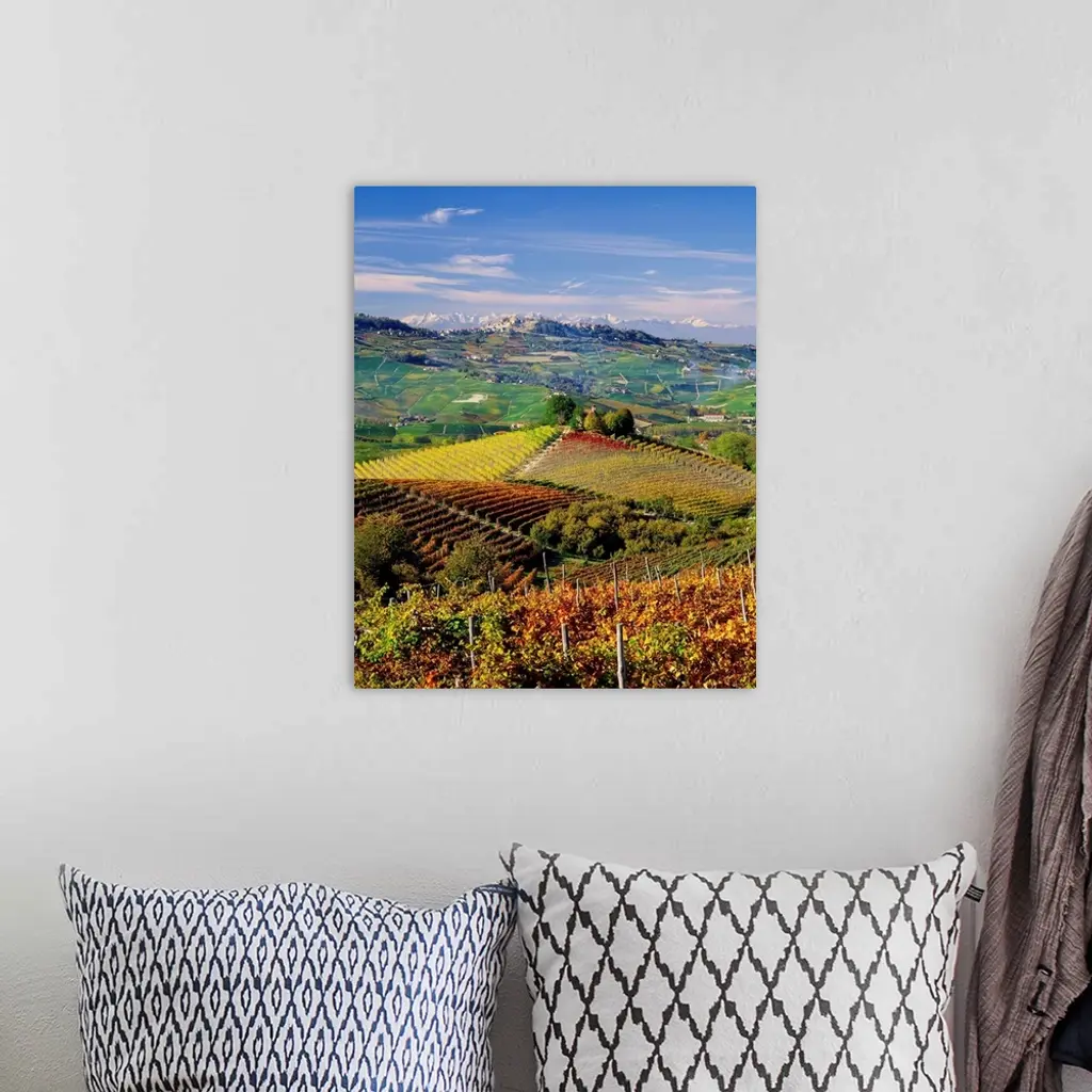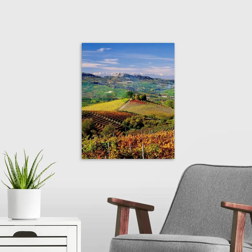 Italy, Piedmont, Langhe, Barolo vineyards and La Morra village in background wall art for home and office decor. Discover canvas art prints, photos, mural, big canvas art and framed wall art in GreatBigCanvas.com's varied collections.