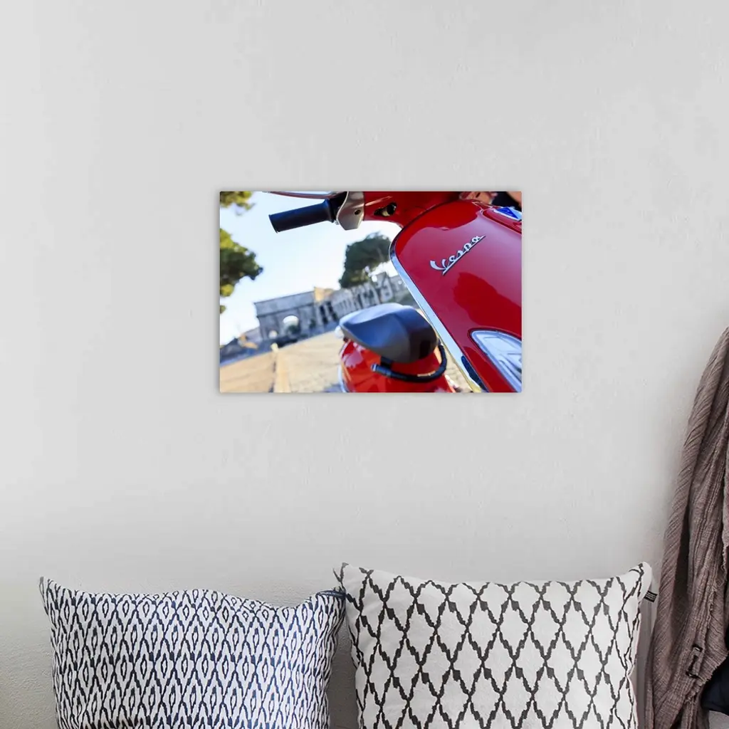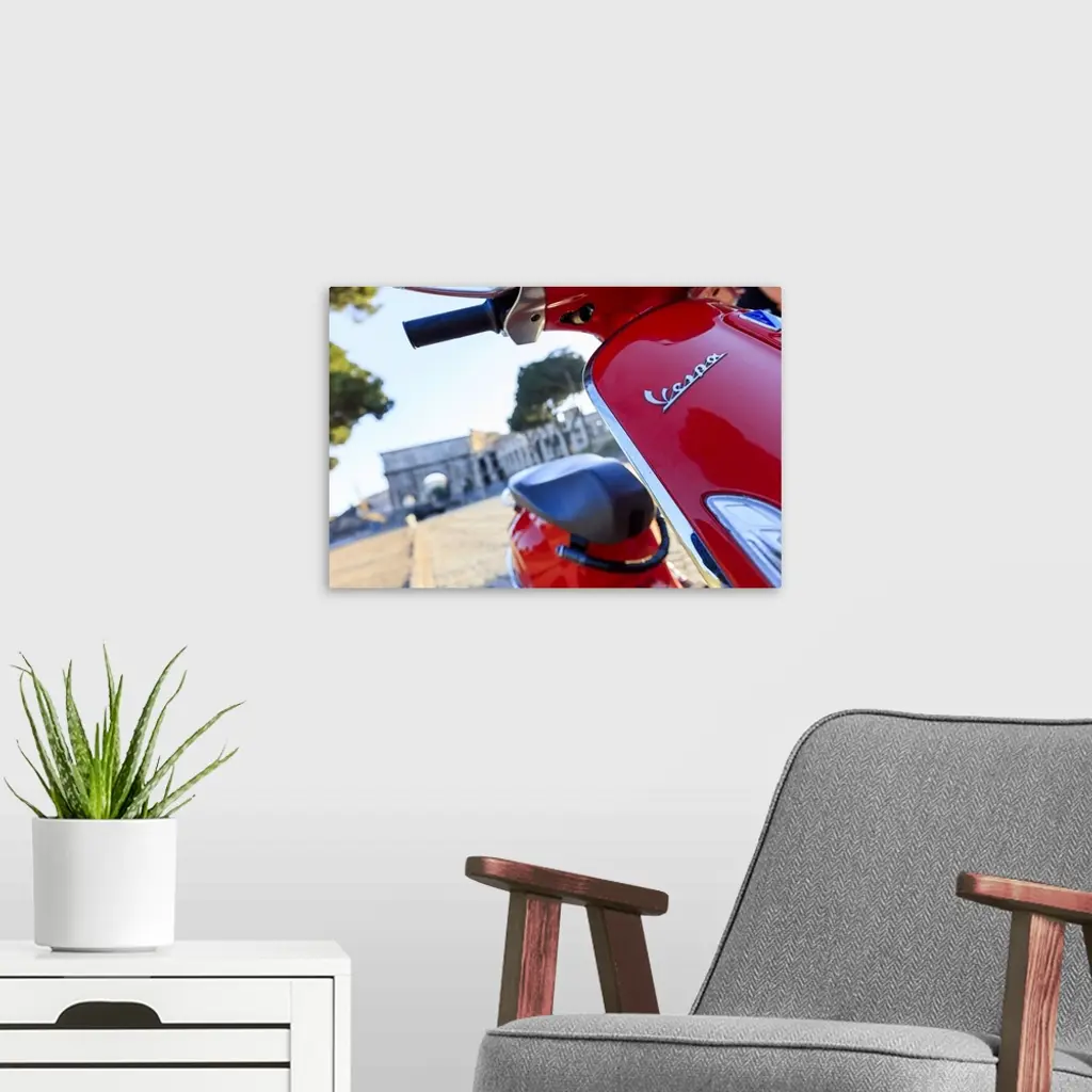 Italy, Rome, Red Vespa Motorbike Enjoying The Sunset At Colosseum And Roman Forum