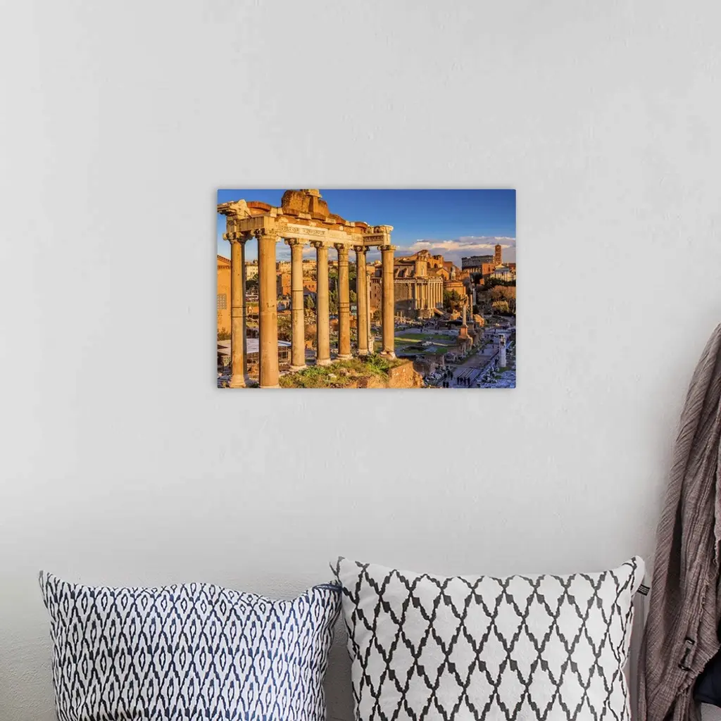 Italy, Latium, Roma district, Rome, Roman Forum, Foro Romano Temple of Saturn, Coliseum in the background.