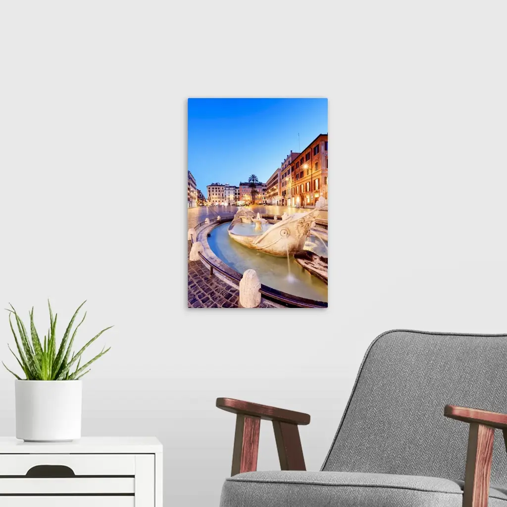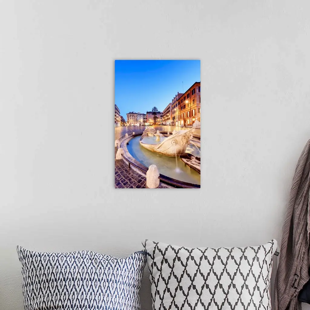 Italy, Rome, Spagna Square With Trinita Dei Monti And Barcaccia Fountain By Night