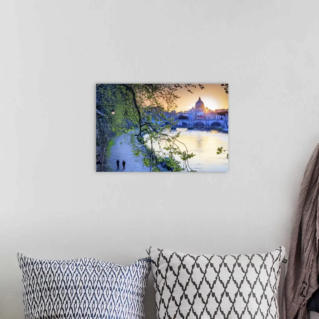 Italy, Rome, St. Peter Basilica at sunset reflecting on Tevere river