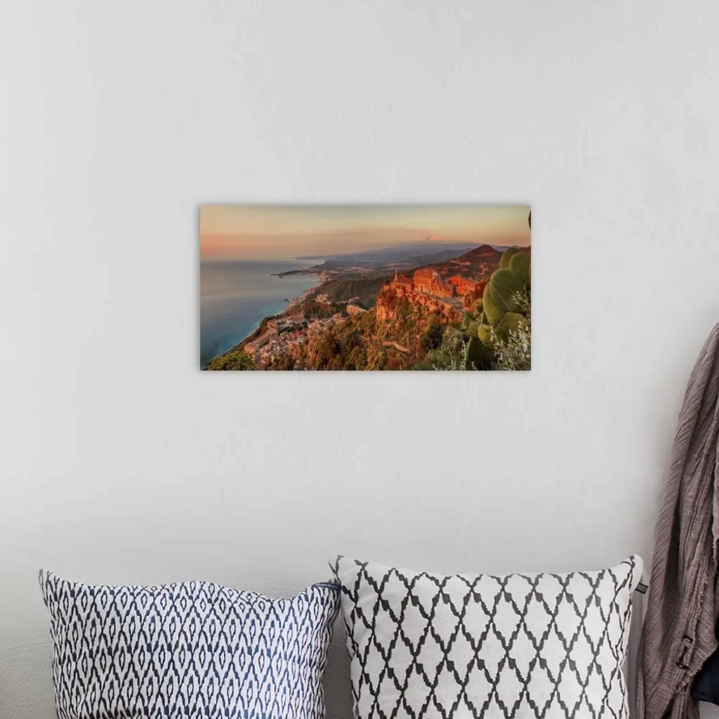 Italy, Sicily, Mediterranean sea, Messina district, Taormina, Ionic Coast from Taormina to Catania with sanctuary of Madonna della Rocca and Mount Etna in the background.