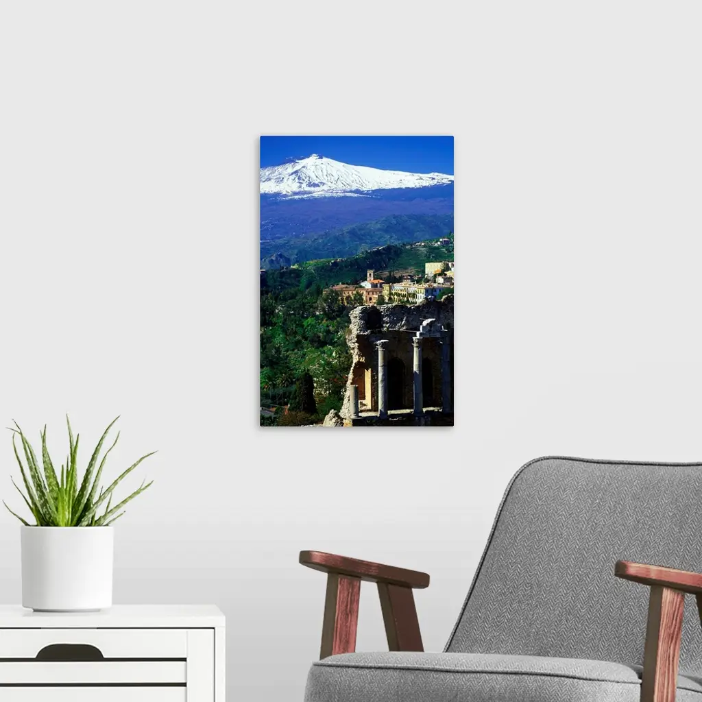 Italy, Sicily, Taormina, Greek theatre, Mount Etna in background wall art for home and office decor. Discover canvas art prints, photos, mural, big canvas art and framed wall art in GreatBigCanvas.com's varied collections.
