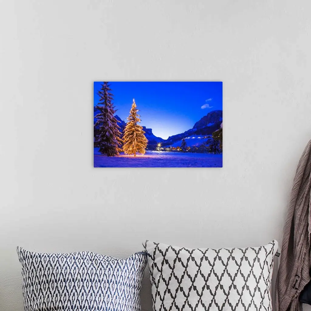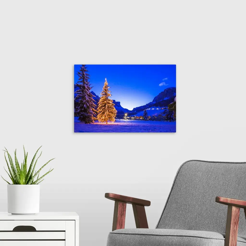 Italy, South Tyrol, Alta Badia, Corvara, Christmas Tree And Gardena Pass