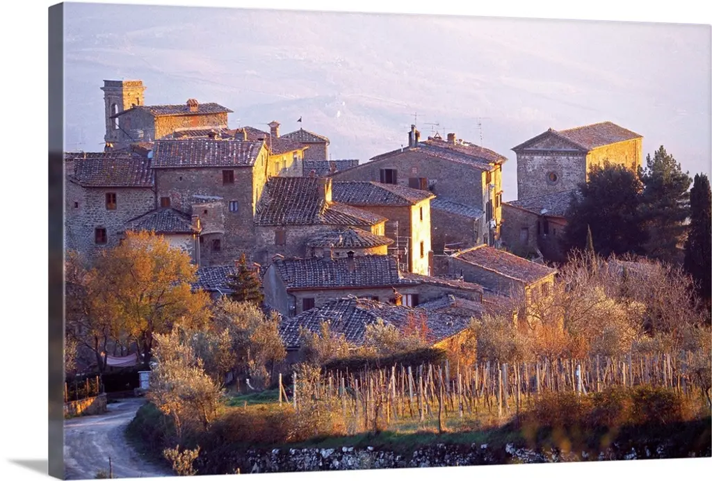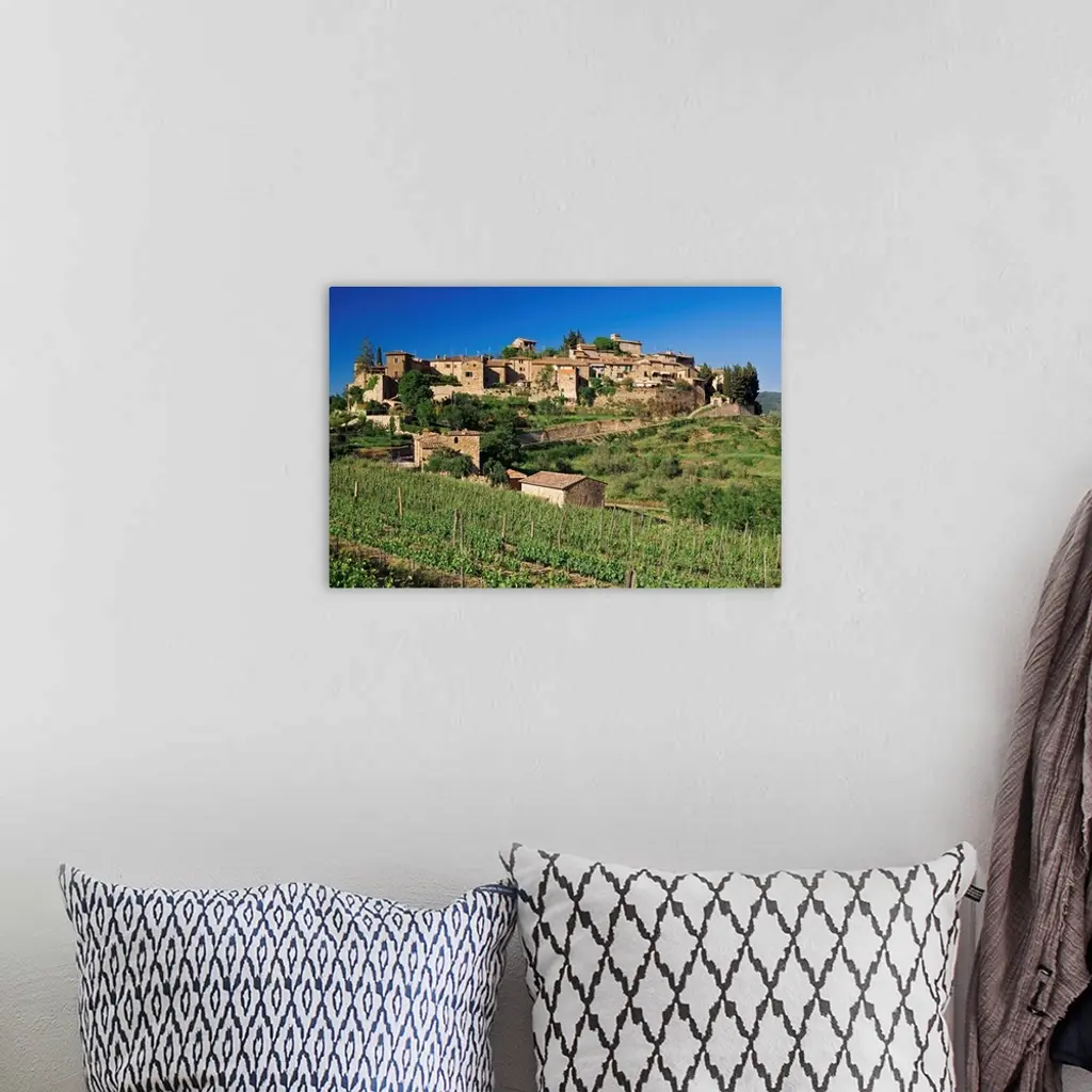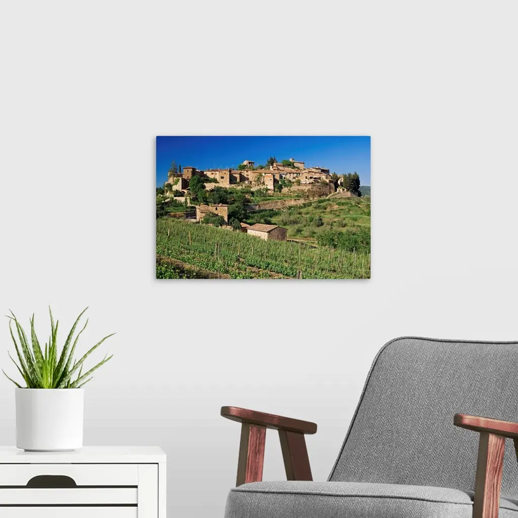 View of the medieval village of Montefioralle, perched on a hill surrounded by vineyards and olive trees near Greve in Chianti.