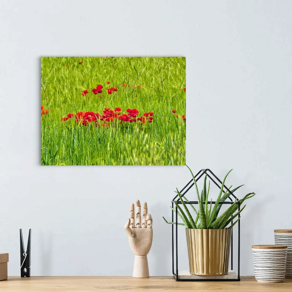 Italy, Umbria, Assisi. Spring poppies in wheat field.