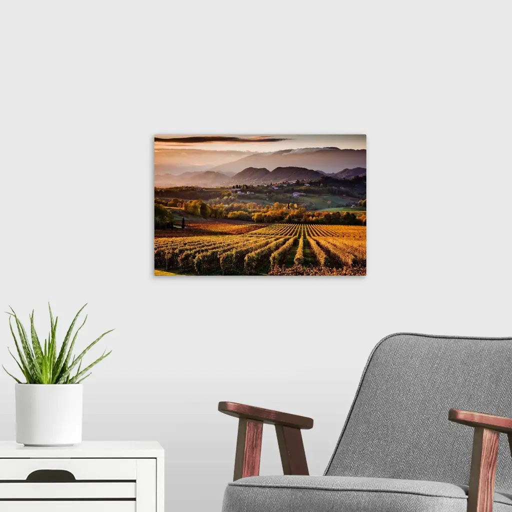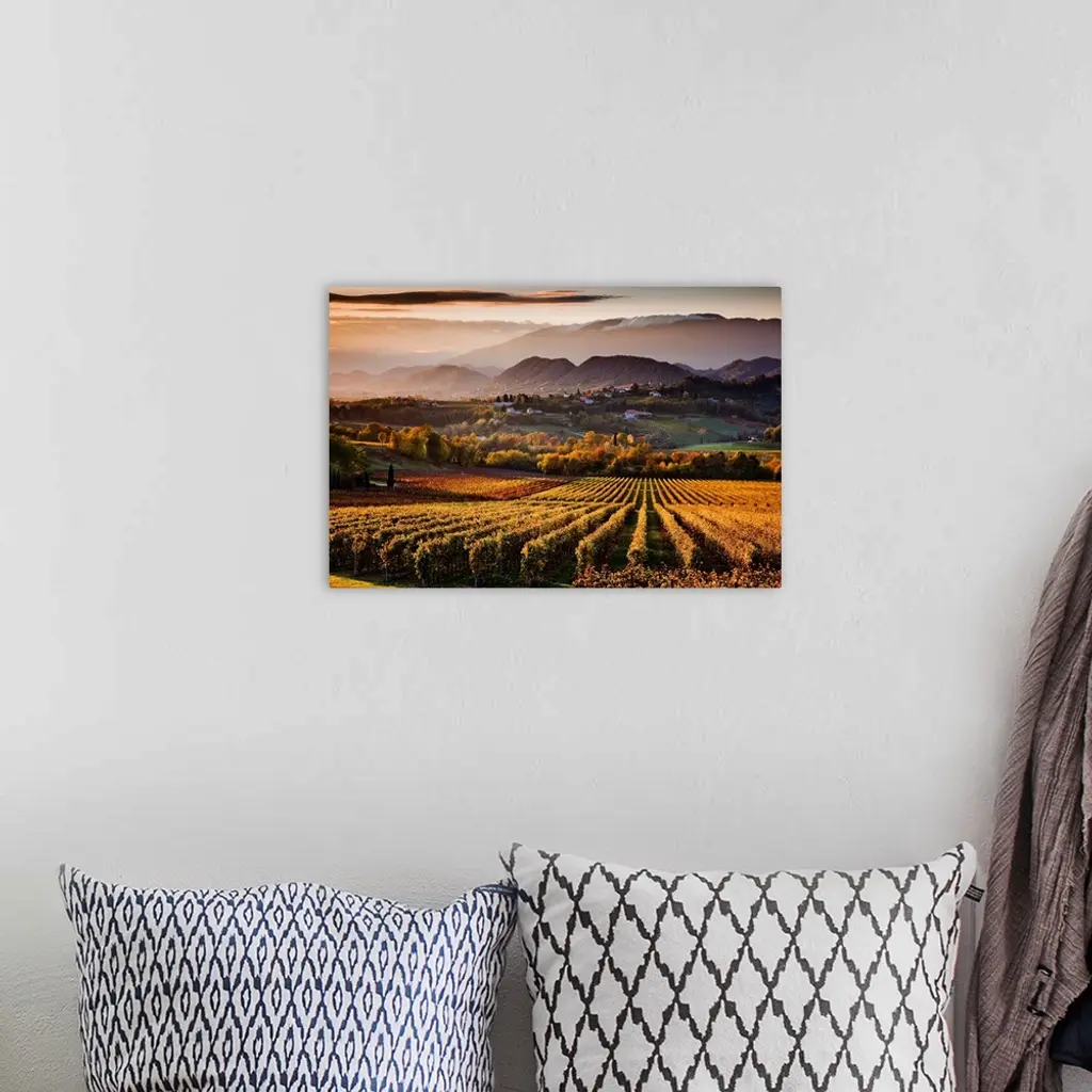Italy, Veneto, San Pietro di Feletto, Prosecco vineyards in autumn wall art for home and office decor. Discover canvas art prints, photos, mural, big canvas art and framed wall art in GreatBigCanvas.com's varied collections.