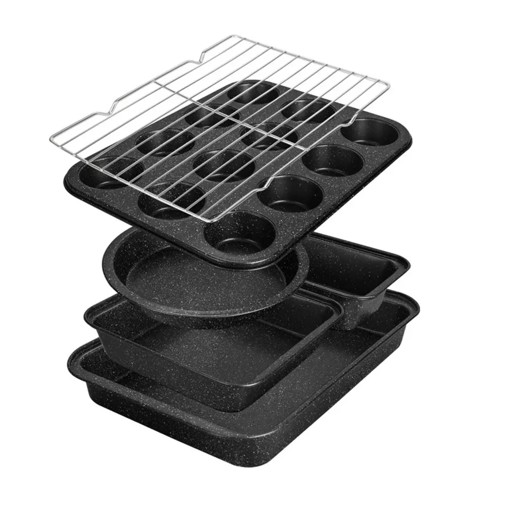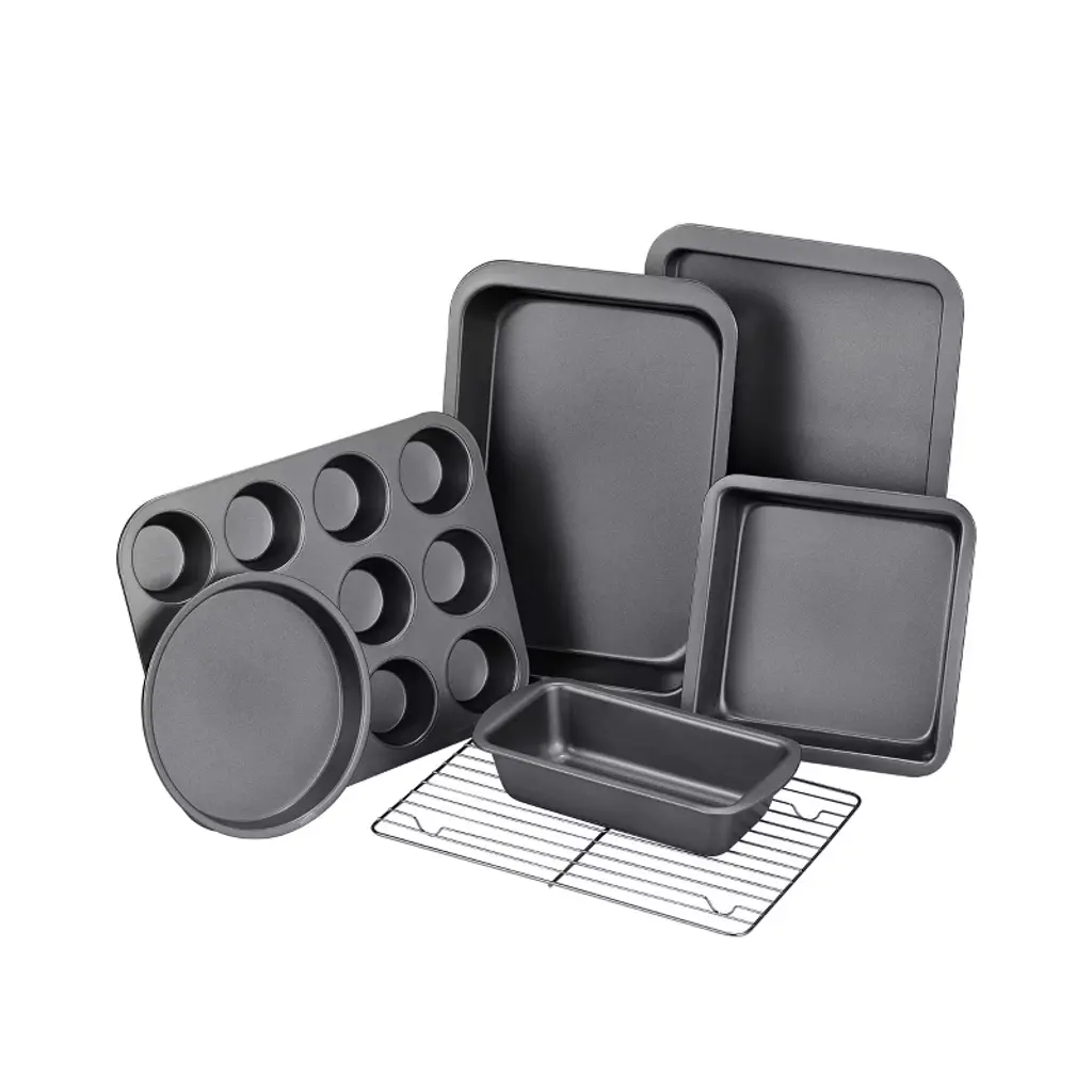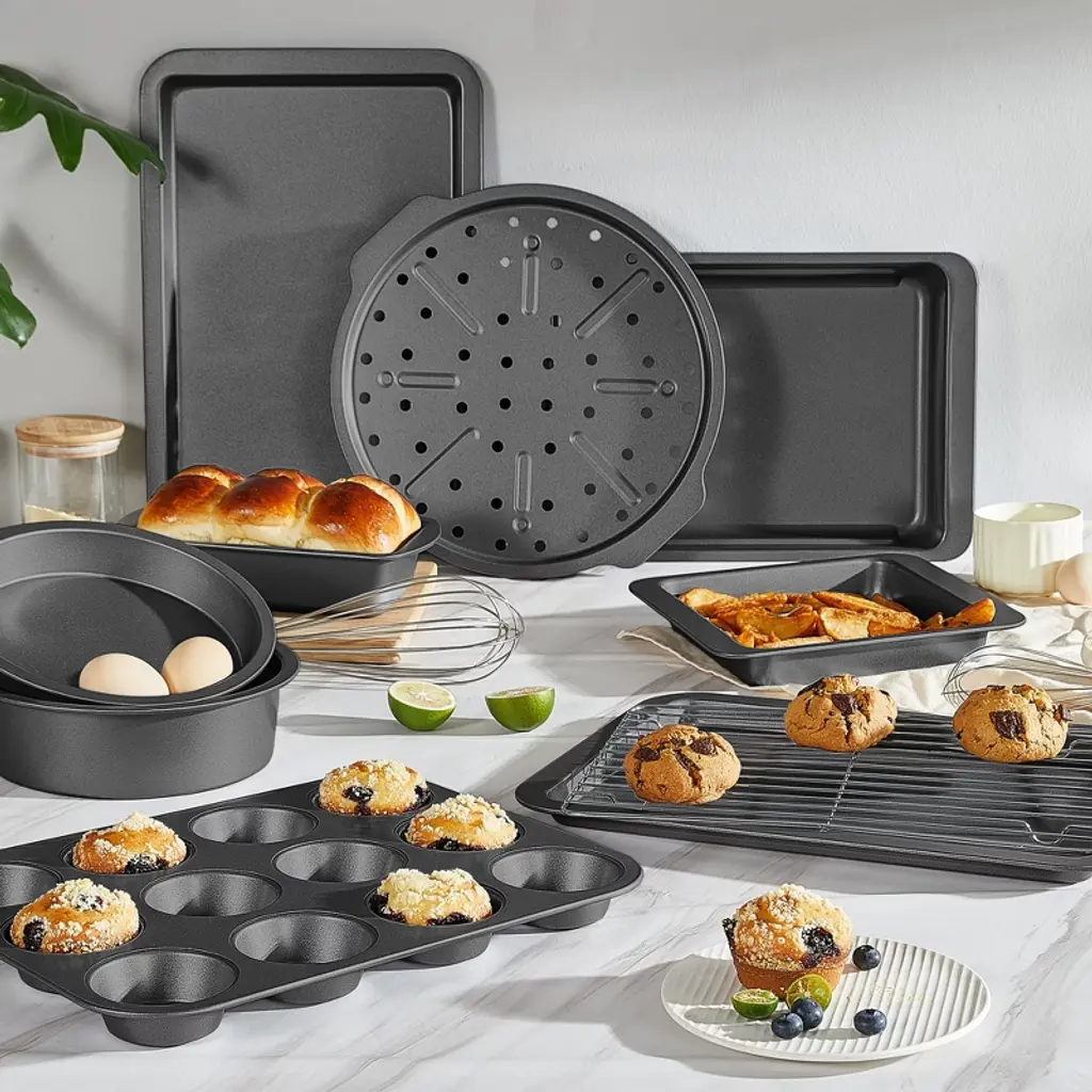 Discover this amazing 10 - piece baking set that's perfect for any kitchen. The set comes with a variety of pans, including roasting, sheet, and cake pans, allowing you to cook a wide range of cuisines. Its widened handles are suitable for all age groups, making it easy to hold and use. The heavy - duty carbon steel construction ensures stability and even heat distribution, bringing out the best flavor of your ingredients. The two - layer, chemical - free coating is non - stick and easy to clean, protecting against scratches and stains. This stackable design saves valuable kitchen cabinet space. Whether you're a professional baker or just love making family recipes at home, this baking set is a must - have!