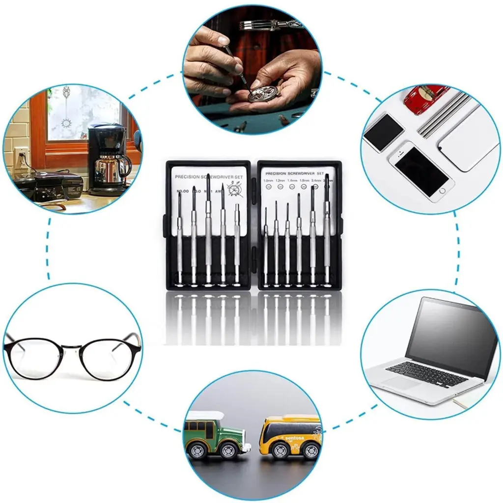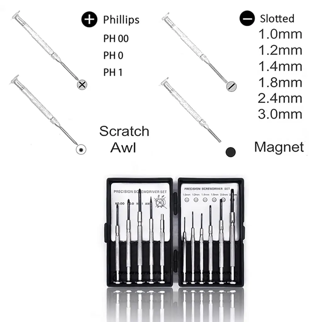 Discover this 11PCS Mini Precision Screwdriver Set, a professional magnetic repair tool for a wide range of items. With 3 Phillips sizes (#00, #0, #1) and 6 flathead sizes (1.0mm - 3.0mm), plus an awl and a magnetic tool, it offers great versatility. The screwdriver set comes with a plastic storage box, making it easy to keep organized and convenient for travel. The hard - tempered black oxide shaft is rust - proof, ensuring long - term use. Its rotating grip design provides a comfortable hand - feel. Whether you're working on jewelry, ring doorbells, watches, iPhones, toys, computers, or eyeglasses, this set is your go - to. For both professionals and home repair hobbyists, it simplifies the process of disassembling, repairing, and reassembling various devices, bringing great convenience to your life.