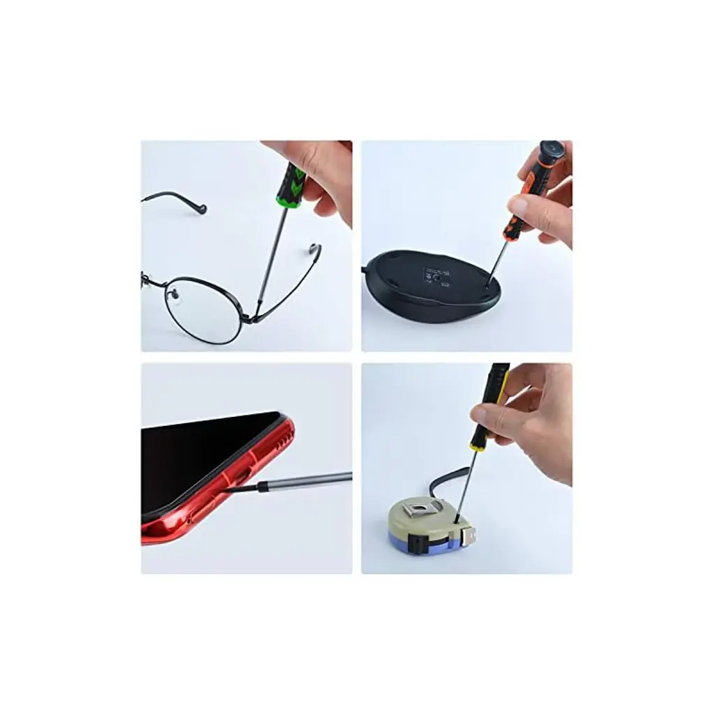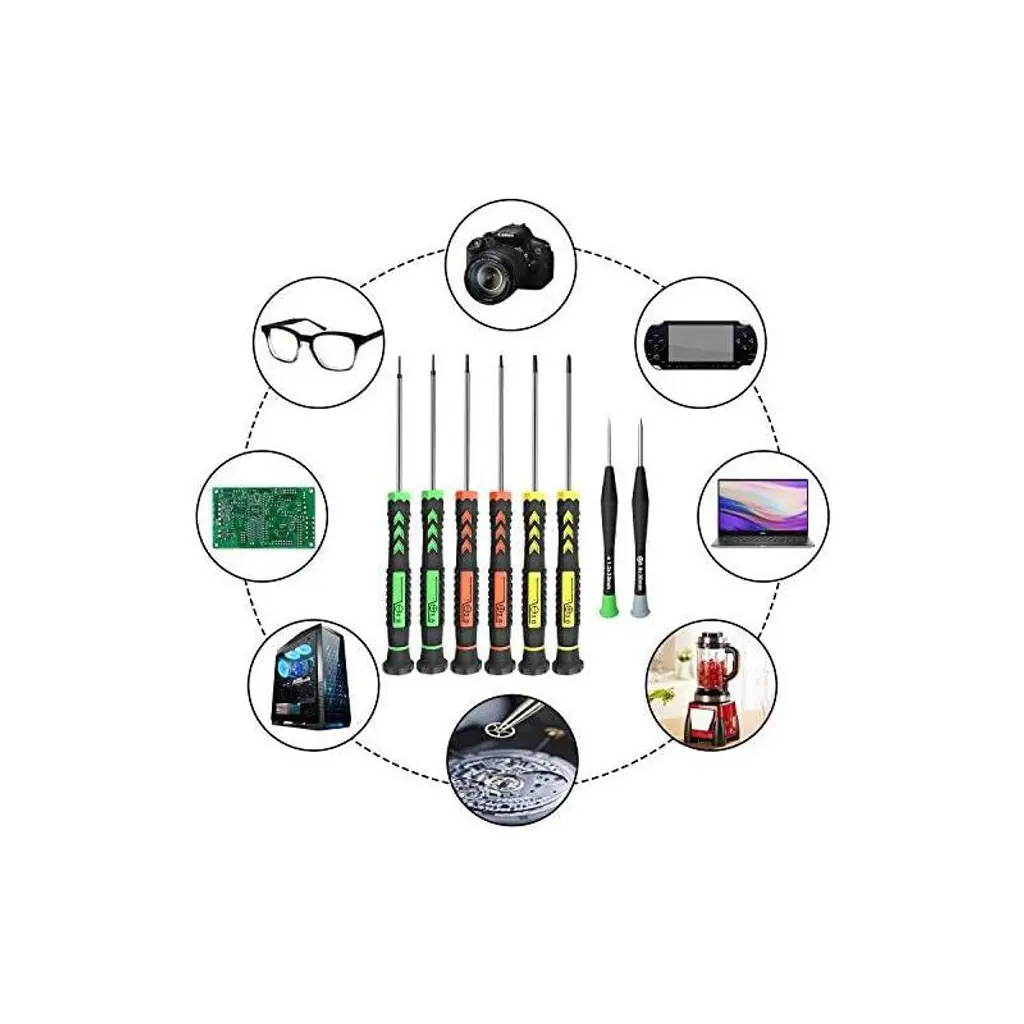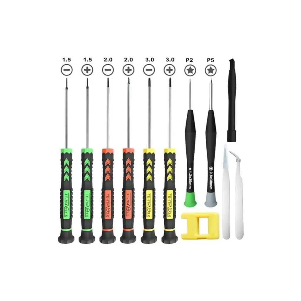 Discover this 12 - piece small screwdriver set, perfect for iPhone, PC, laptop, eyeglass, jewelry, and watch repairs. The set features flathead, Phillips, and Pentalobe screwdrivers in different sizes, along with a helper stick, tweezers, and a magnetizer & demagnetizer tool. Crafted from stainless steel, the screwdrivers are strong and durable, while the non - slip PP+PVC handles ensure a comfortable grip. The magnetic function makes it easy to handle screws, and the blackening treatment prevents rust. The 360°rotating cap saves effort, and the color - coded screwdrivers are easy to identify. Whether you're a professional repairer or a DIY enthusiast, this set is a must - have for all small - scale repair jobs, offering a comprehensive and efficient solution.