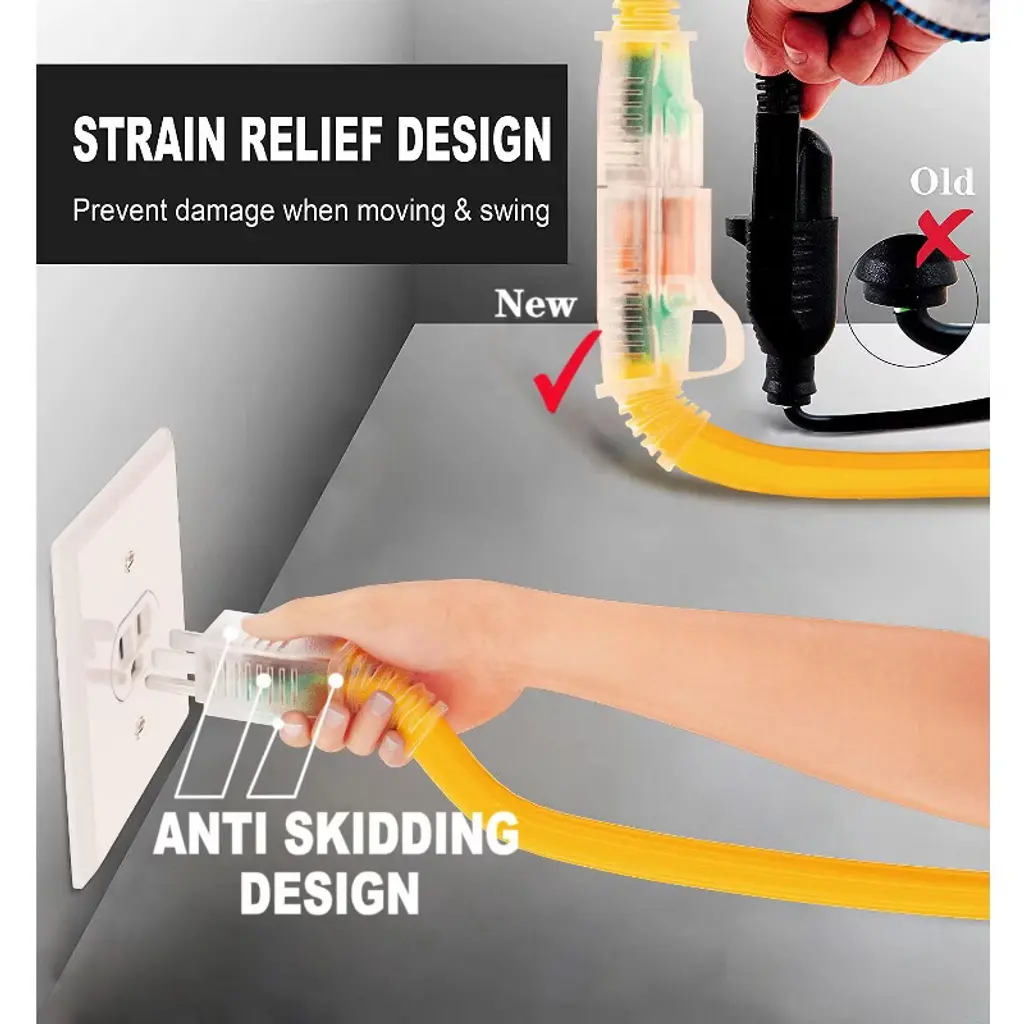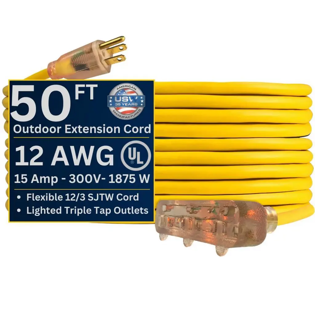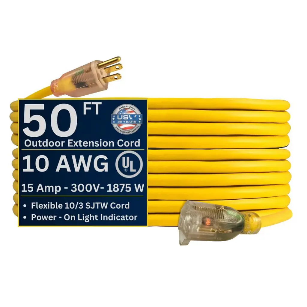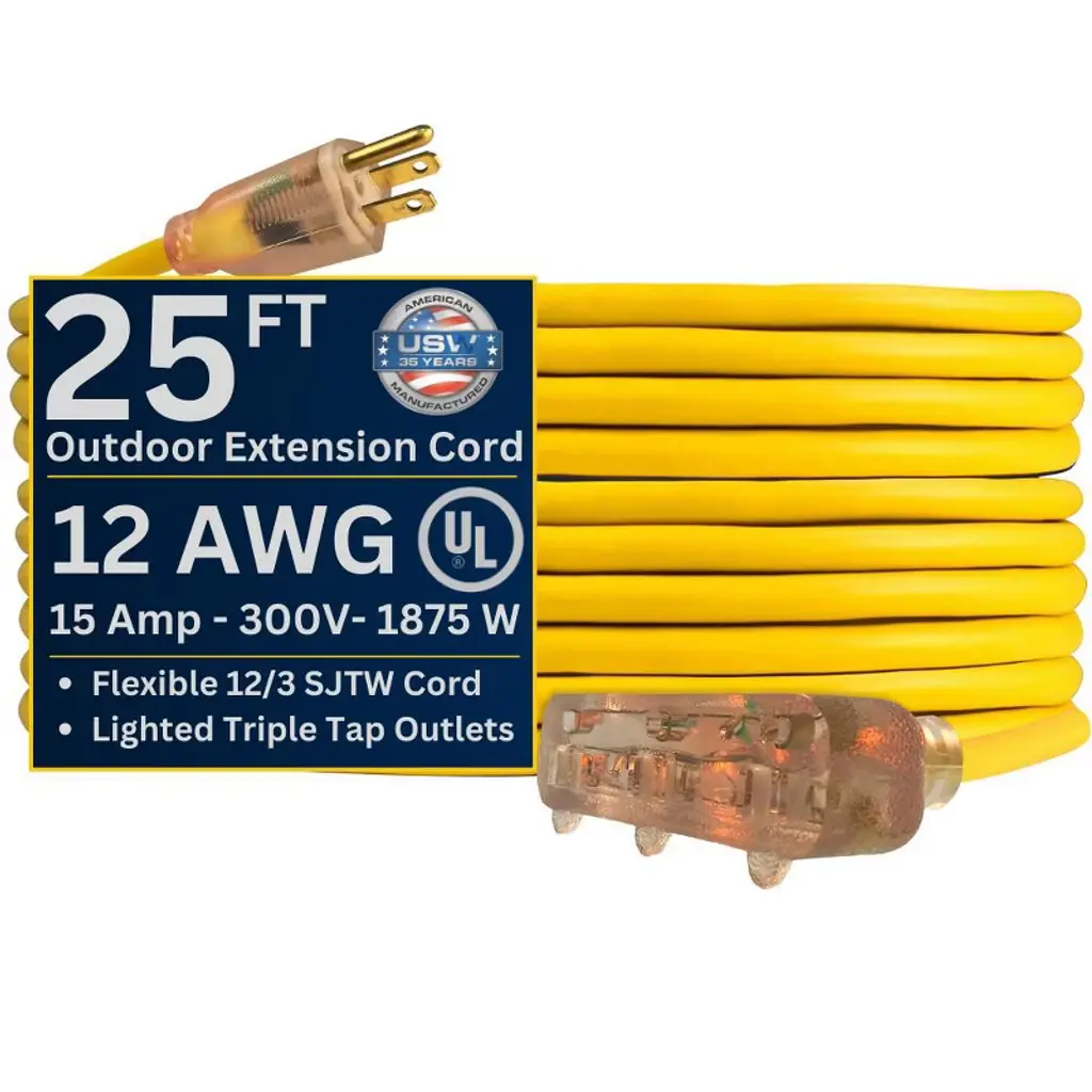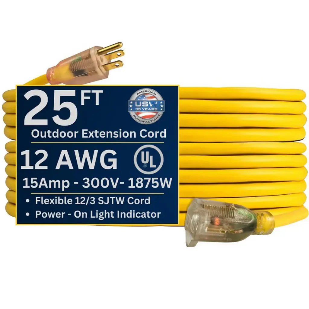 Discover this heavy - duty 25 - ft extension cord with a 12/3 gauge, rated at 15 amps, 125 volts, and 1875 watts. Its lighted end indicates power status, and the extra - sized plugs offer enhanced safety. The PVC outer jacket is flame - resistant, waterproof, and cold - resistant down to - 50°C, suitable for indoor and outdoor use, whether at home, in the office, or in industrial settings. The cord is highly flexible, with a soft feel and excellent bending resistance. It won't break easily during long - term use. The plug and socket have strain - relief designs for durability, and the socket's hook design allows for easy hanging in humid areas. Each cord is packed with storage straps for convenient storage and reuse. Get this reliable extension cord for your various power needs.