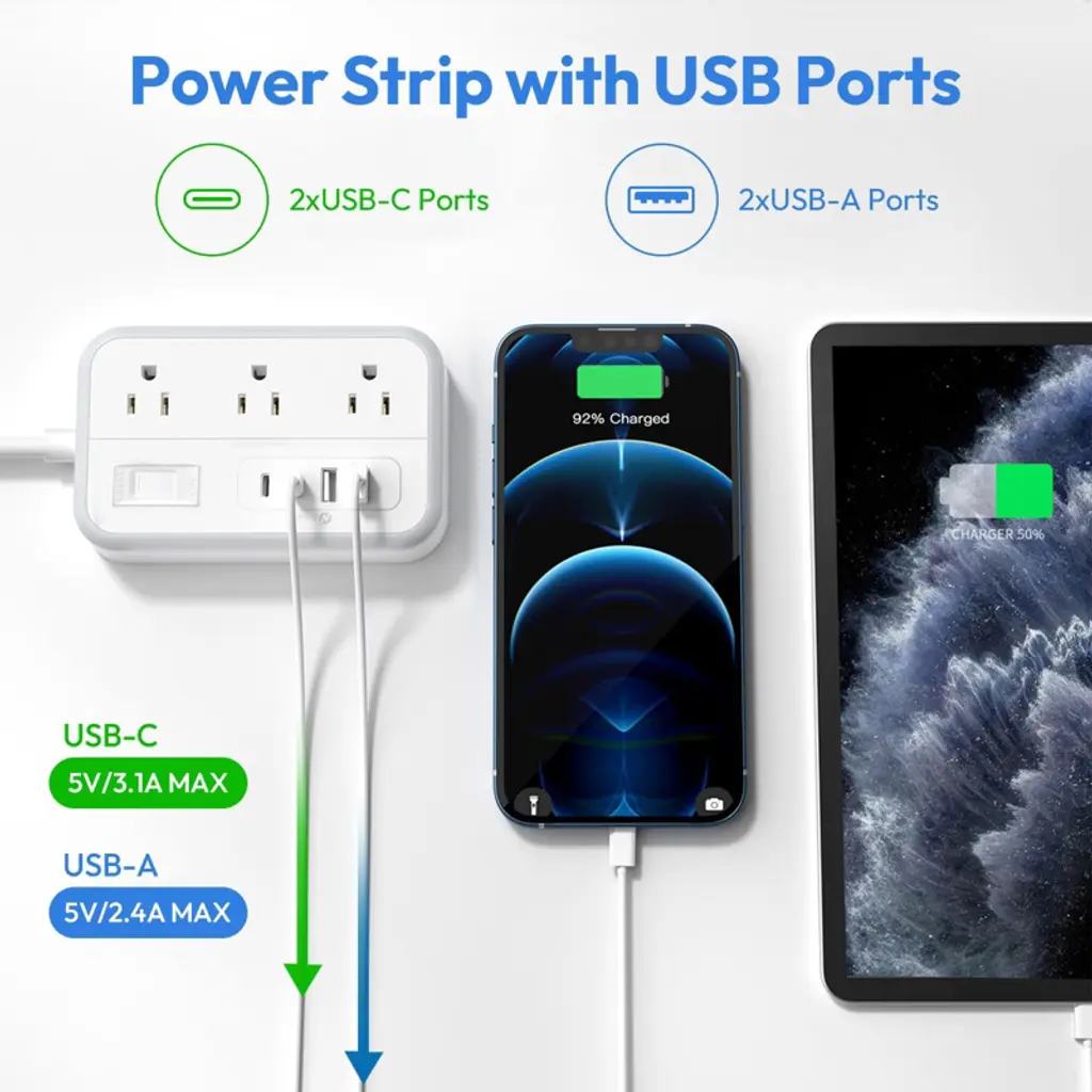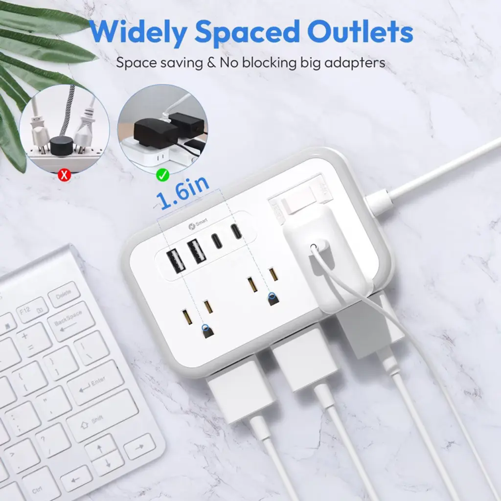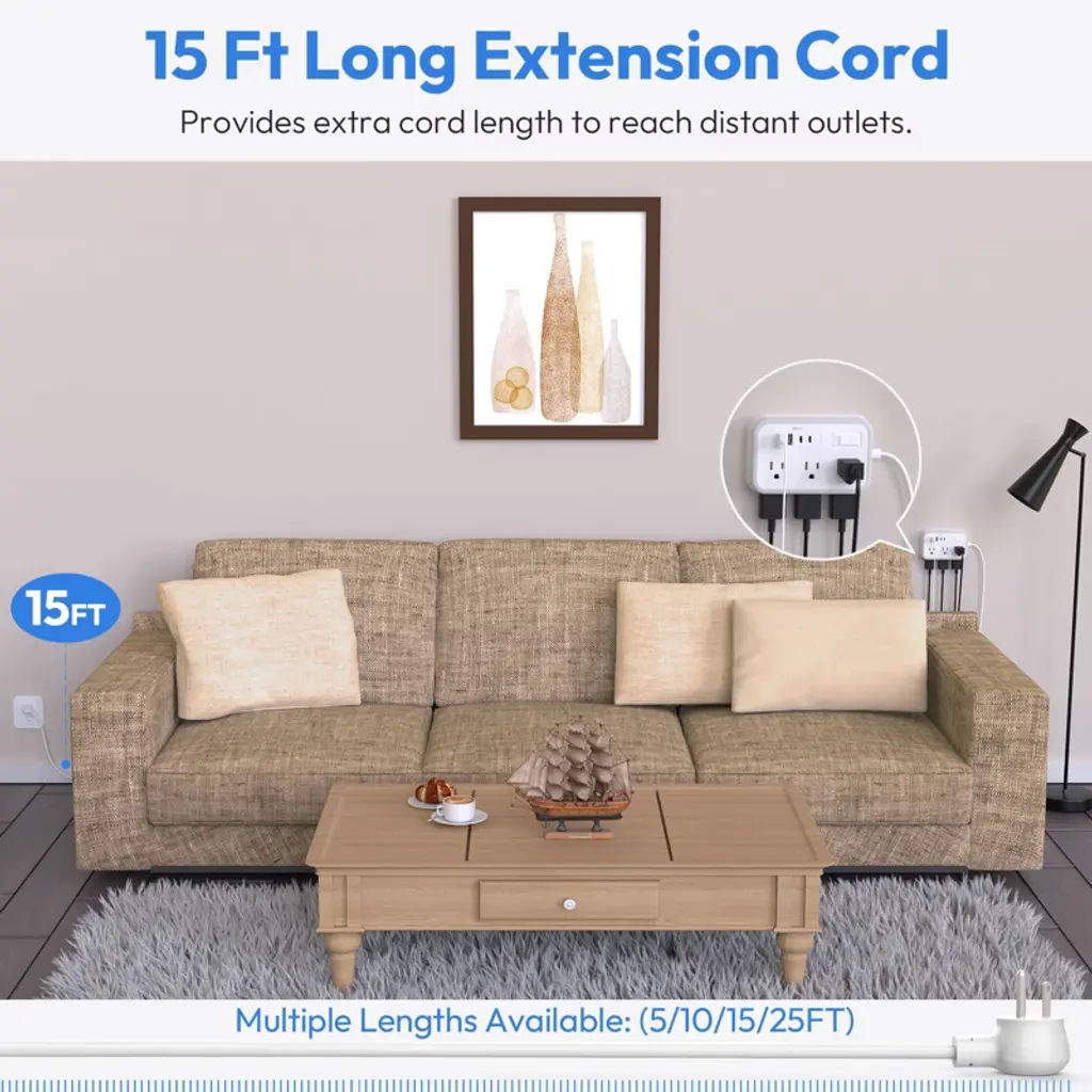 Looking for a versatile and reliable power solution? Our 15 - foot extension cord surge protector is the answer. It features a flat plug for easy access to distant outlets and tight spaces. With 6 outlets and 4 USB charging ports (5V/3.1A), it can power up to 10 devices at once. The built - in Smart IC technology auto - detects device requirements, eliminating the need for multiple converters and supporting a wide voltage range of 100 - 240V. It has two mounting methods, allowing for horizontal or vertical installation on workbenches, walls, etc., saving valuable space. The well - spaced outlets can accommodate big transform plugs. The overload protection switch ensures safety by automatically shutting off when a power overload (1250W) is detected. This product is a must - have for homes, offices, dorm rooms, and apartments, bringing convenience and safety to your daily life.