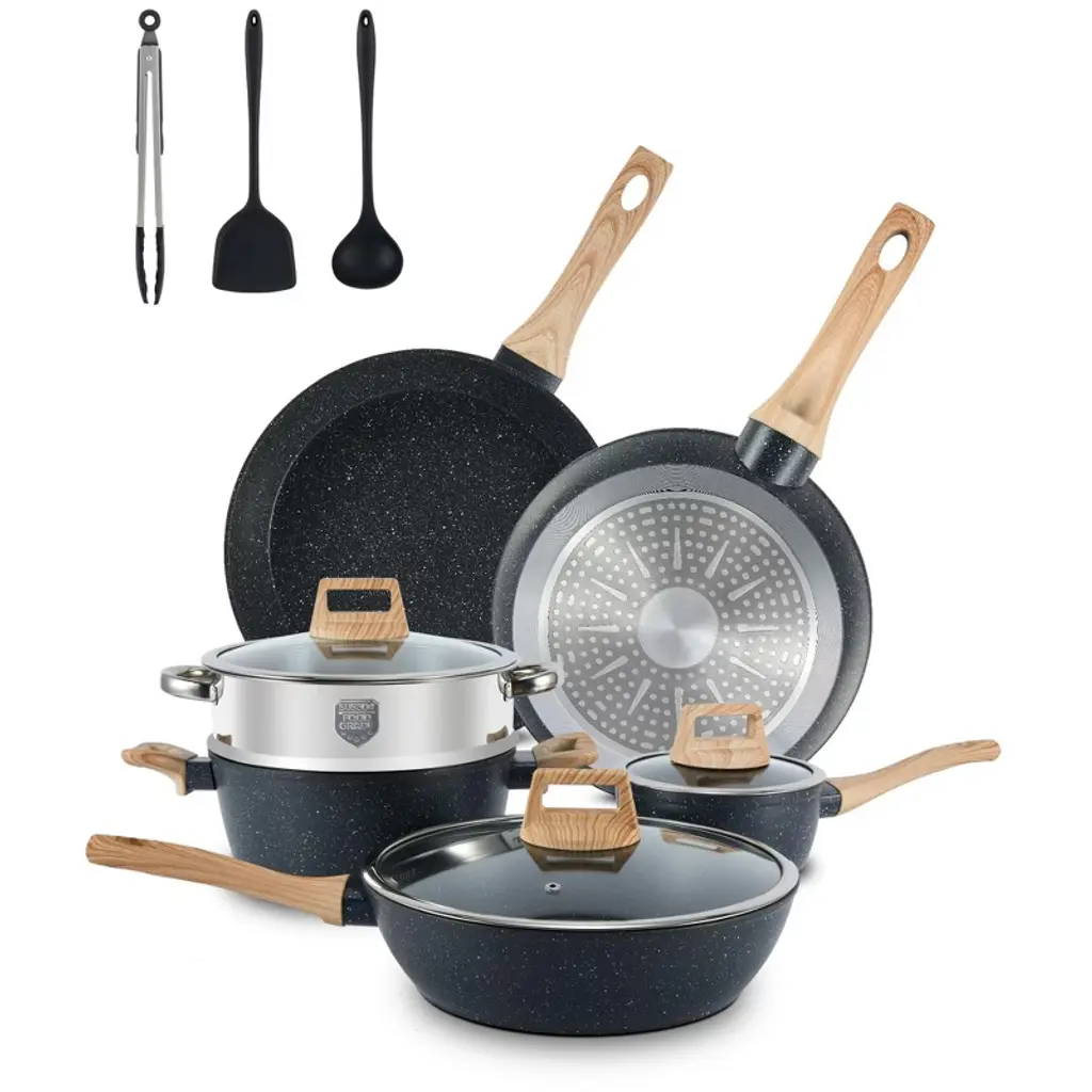 Discover the ultimate kitchen essential - a 19 - piece non - stick pots and pans set. Crafted with a titanium non - stick coating, it offers effortless food release and easy cleaning, while preventing stains and odors. The electroplated wood - grain handles are designed for comfort, heat - resistance, and a secure grip. The shatter - resistant glass lids allow you to watch the cooking process without splatters. This set is versatile, compatible with induction, gas, and ceramic stovetops, ensuring even heating. It comes with a comprehensive collection of cookware and accessories, including fry pans, saucepans, a stockpot, pan protectors, a silicone mat, and cooking utensils. Ideal for preparing breakfast to dinner for the whole family, it's non - toxic, free of harmful chemicals, and a great choice for any kitchen. Whether for a special occasion or daily use, it simplifies your cooking and brings convenience to your life.