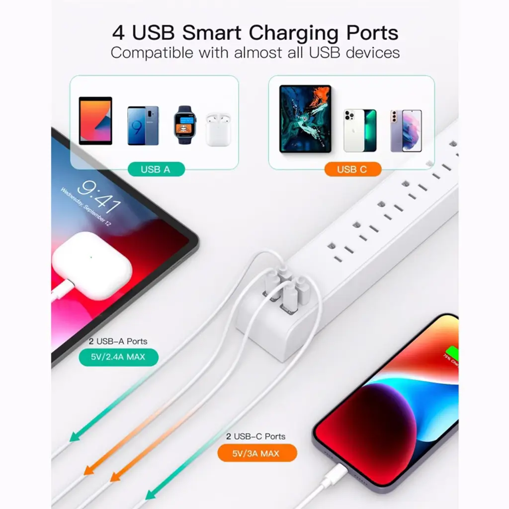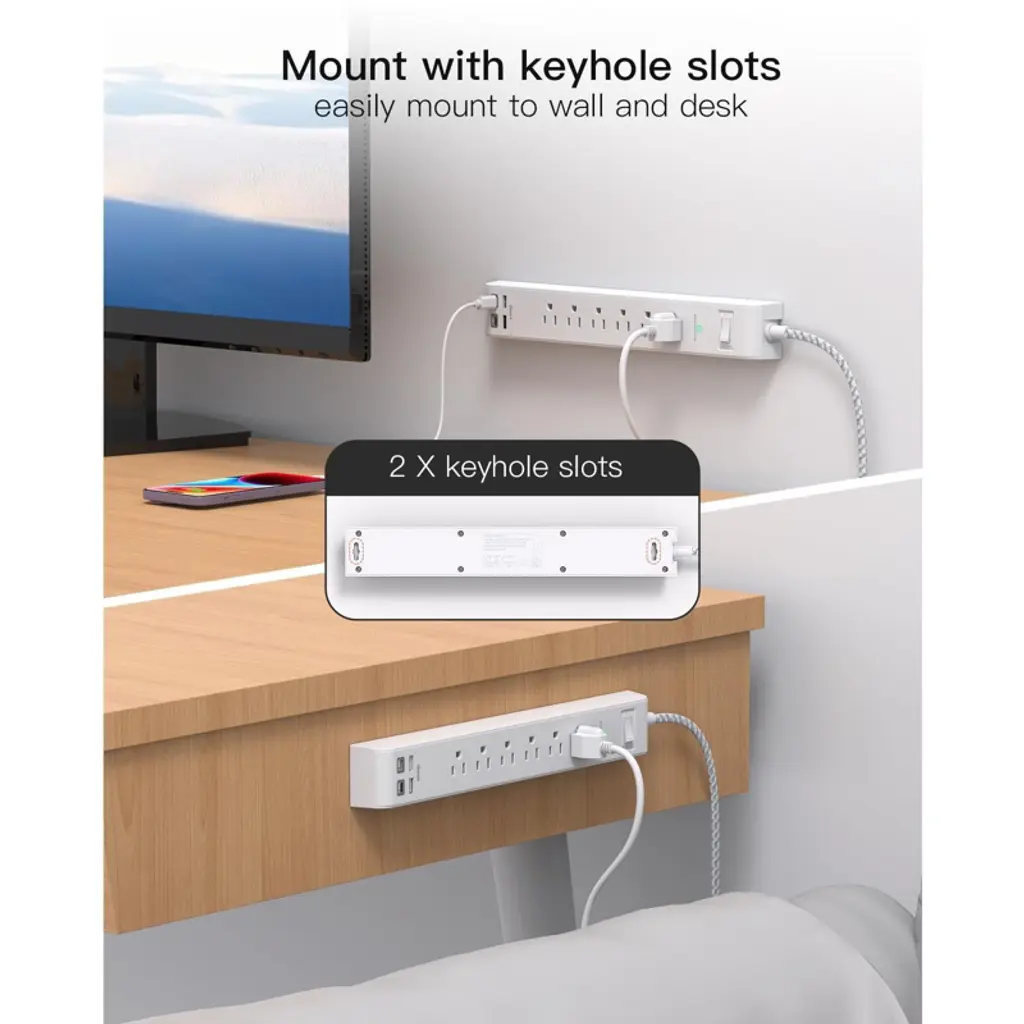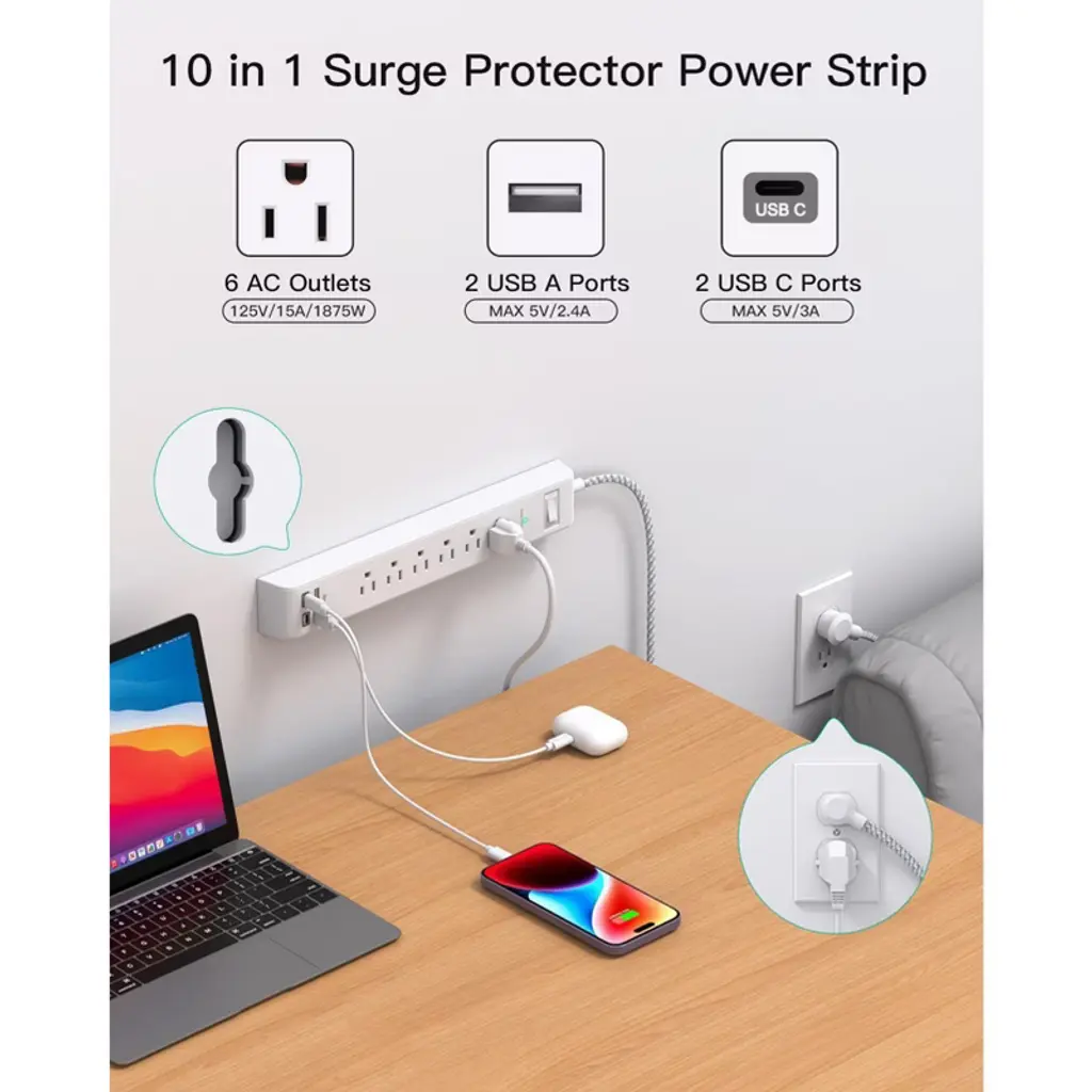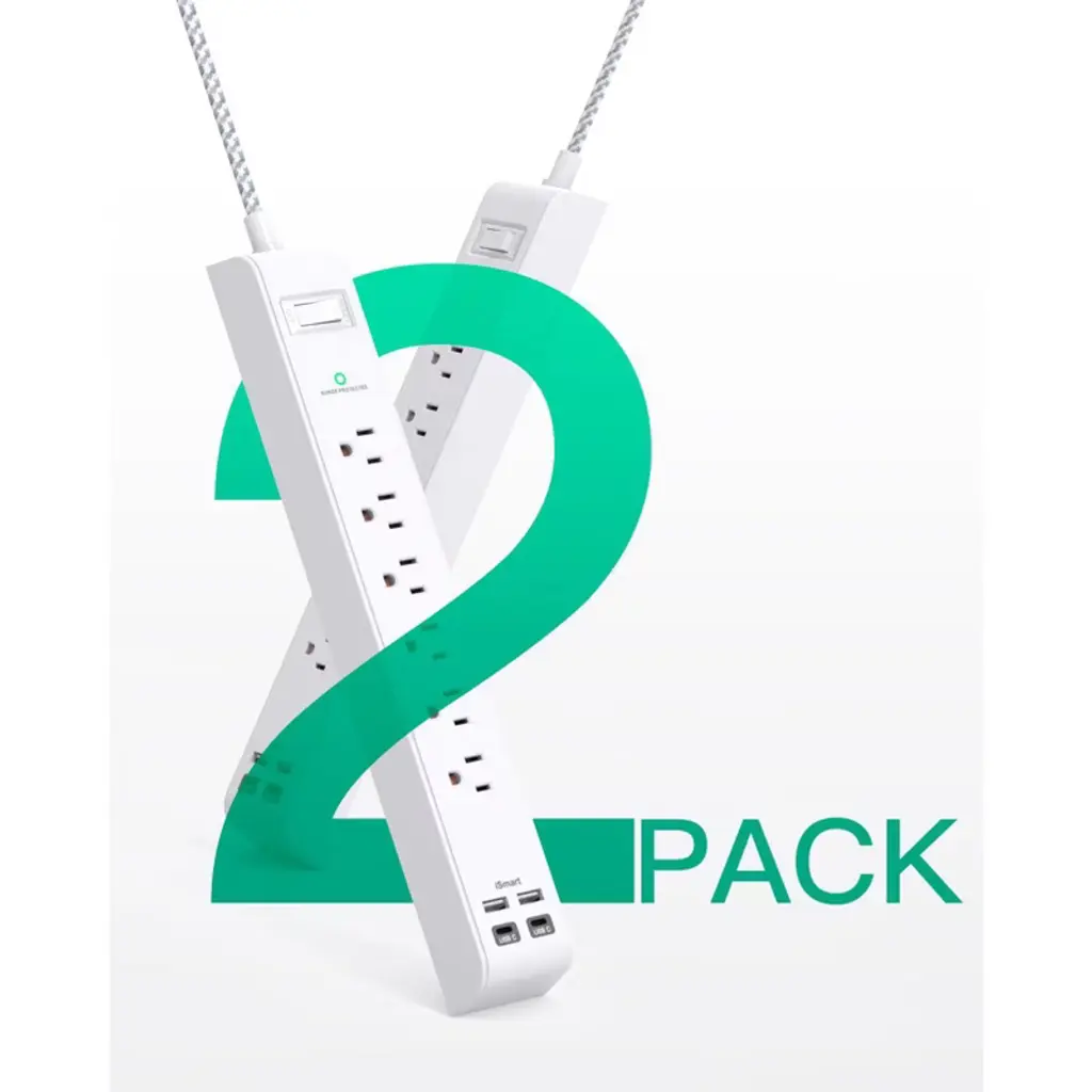 Discover this 2 - pack power strip that combines functionality and safety. With 6 AC outlets and 4 USB ports, it offers a total 5V/3.1A output, auto - adjusting the charging rate for a wide range of electronic devices. The overload protection with a 1080 - Joule energy - absorbing capacity safeguards your devices from power issues. The 12FT upgraded braided extension cord is thick and efficient, with a 13A current - carrying capacity. Its braided design makes it tangle - free and durable, and the fire - resistant PC shell can handle high temperatures. The 45° flat plug allows furniture to be placed close to the wall, and the 4 keyhole mounting slots let you mount it on the wall or desk. This 10 - in - 1 power strip is perfect for home, office, dorm, or college use, providing a stable and convenient power source for all your devices.