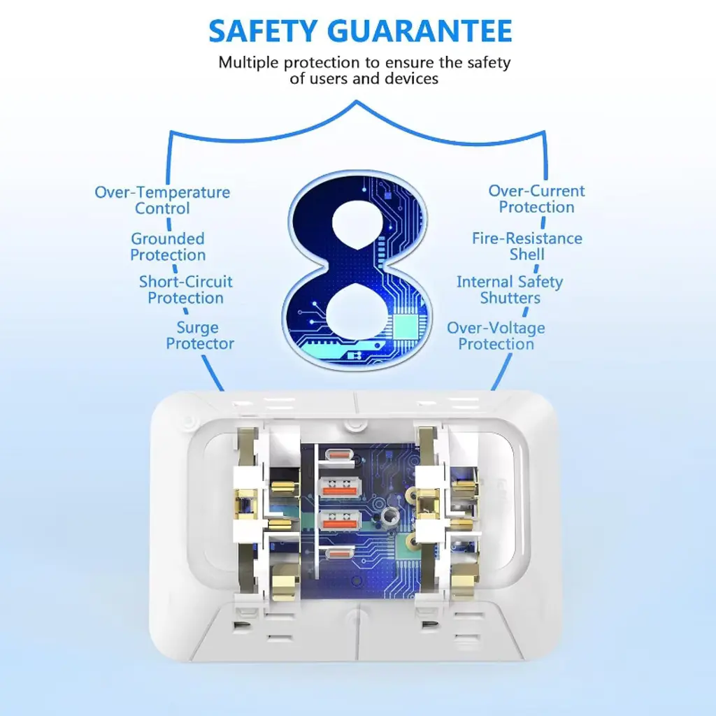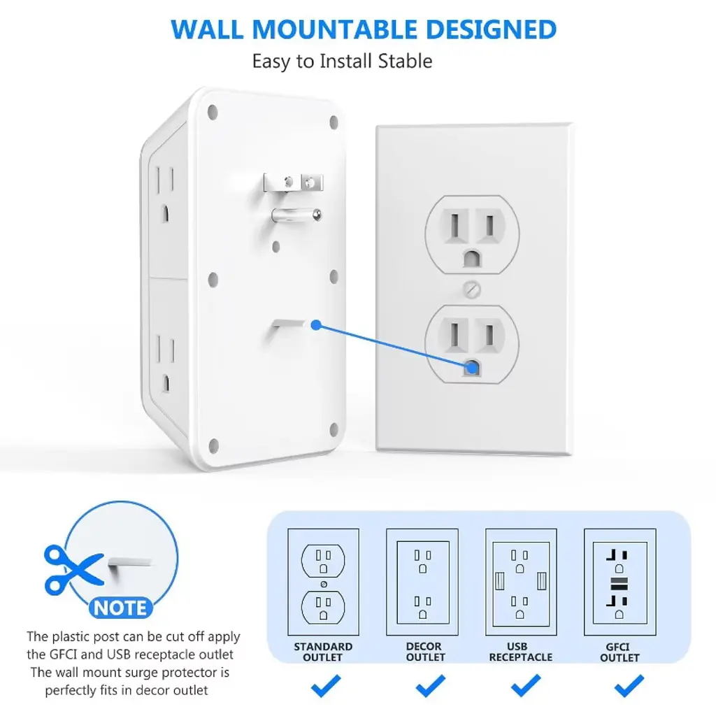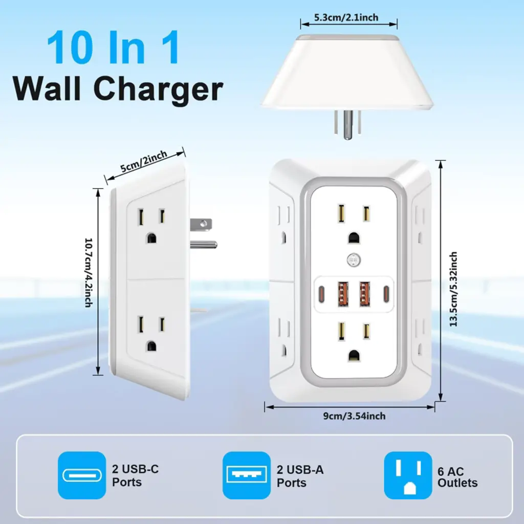 Get this 2 - pack wall charger with a 10 - in - 1 function! It comes with 6 AC outlets, 2 USB - A ports, and 2 USB - C ports. Just plug it into a duplex outlet, and you're good to go. The screw port ensures a tight fit. The USB ports have a 5V/2.4A Max output and use smart technology to detect devices for optimal charging speed. With 1050 Joules of surge protection and made of top - grade UL94 V - 0 flame - retardant material, it keeps your appliances safe. The 2.15 - inch wide spacing between outlets allows for easy use of all plug types. It supports a maximum current of 15A and 1875W of power, solving your socket shortage. Whether you're traveling, in a dorm, at home, or in the office, this charger is a convenient addition to your daily life.