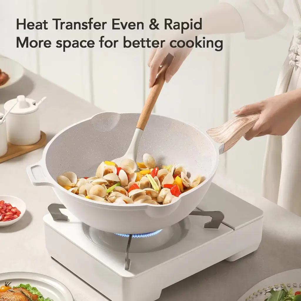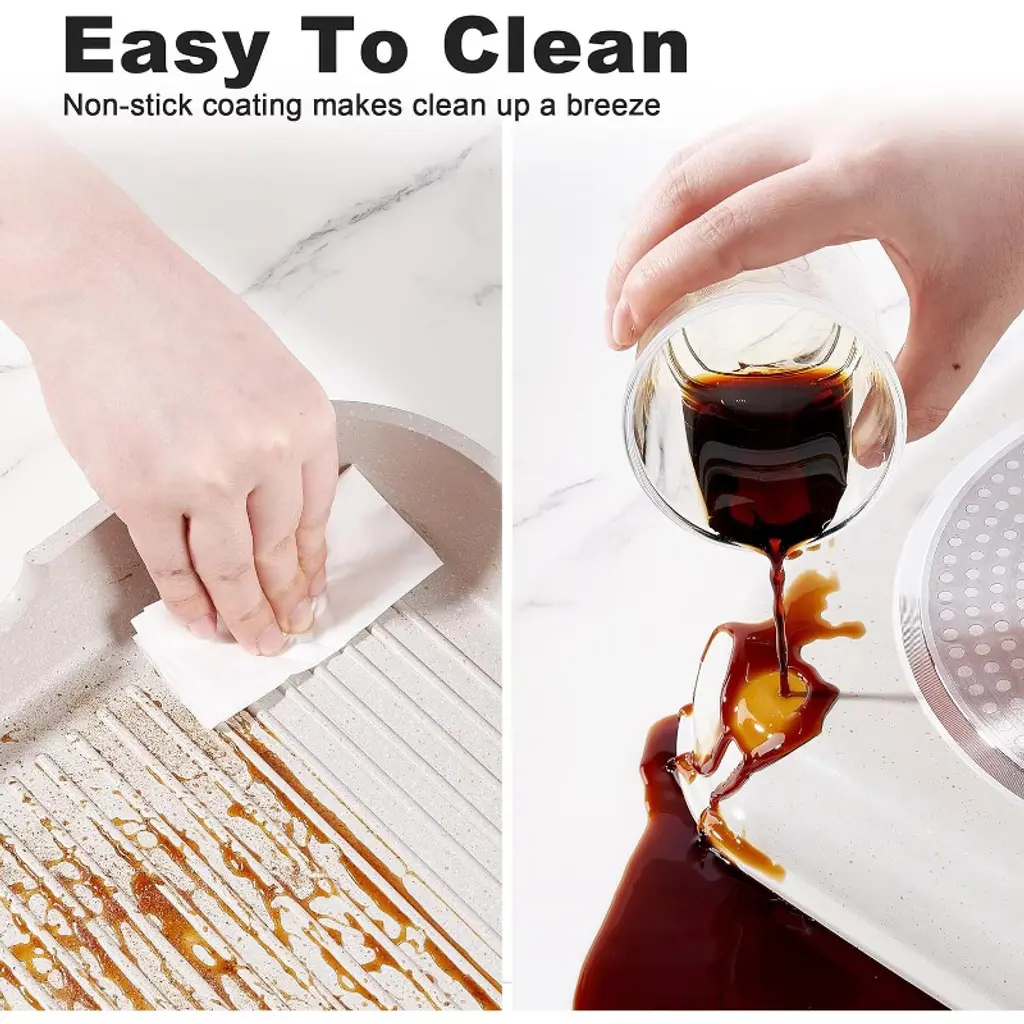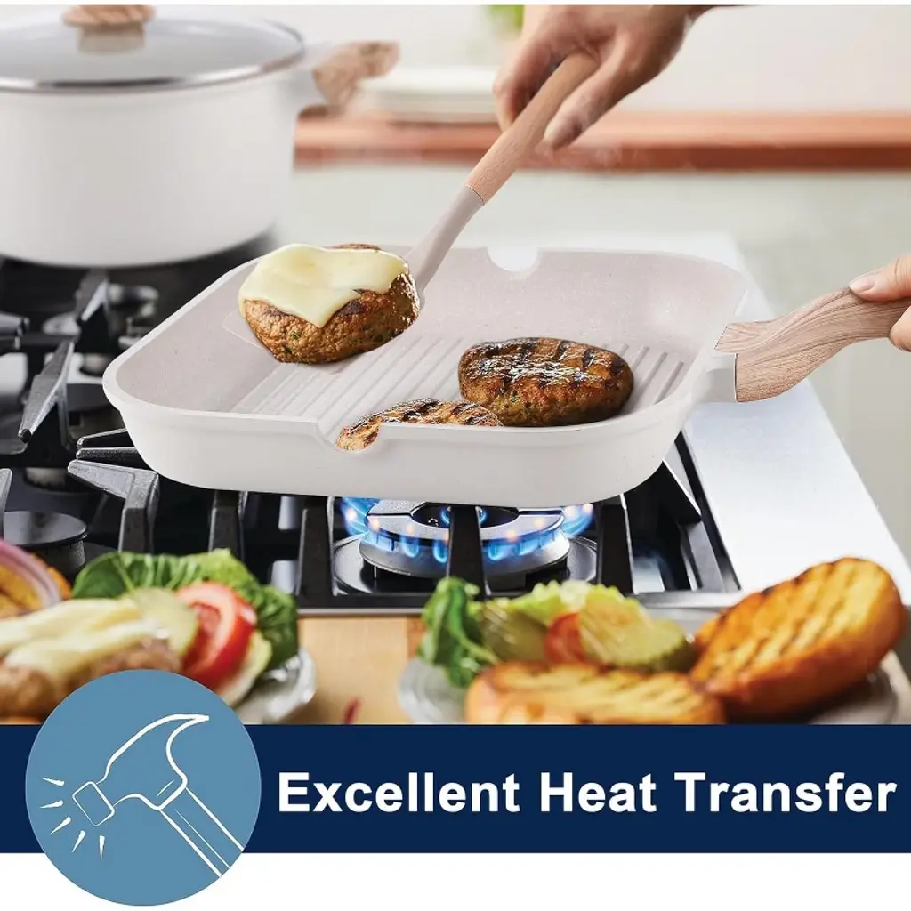 Discover this 20 - piece cookware set that's a must - have for any kitchen. It features a granite non - stick coating, which means food won't stick, and you can cook with less oil. Cleaning is super easy; just wipe it or rinse with water. Whether you're making a simple breakfast on a weekday or a big dinner for a family gathering, this set can handle it all. It's compatible with all types of stovetops, including induction ones where it heats up quickly. The griddle has a ridged edge that gives meat those amazing grill marks, adding a touch of outdoor cooking to your indoor kitchen. The set is PFOS and PFOA free, ensuring a healthy cooking experience. With this cookware set, you'll enjoy a more convenient and enjoyable cooking process.