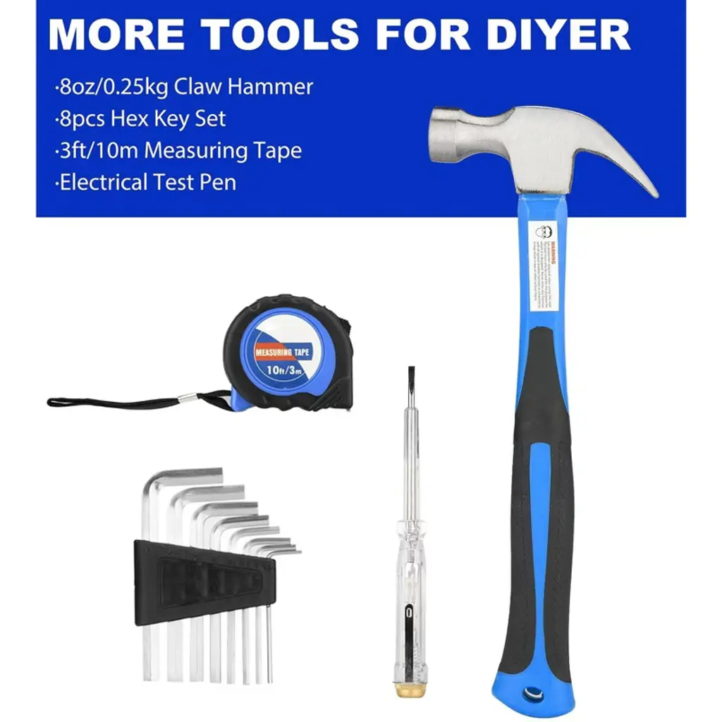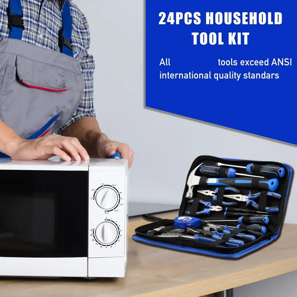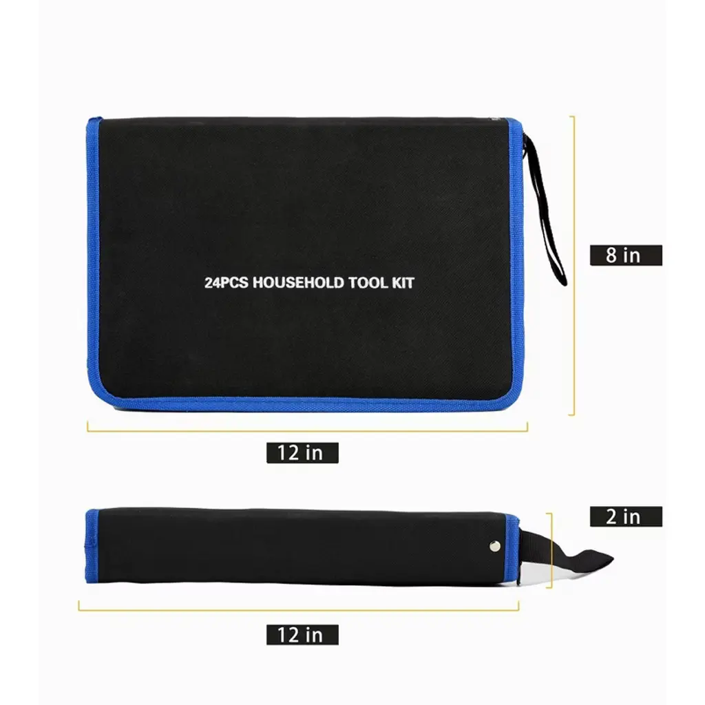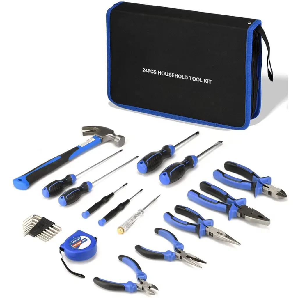 Discover this 24 - piece household tool kit, a perfect companion for all your repair needs. Crafted with high - quality steel and finished in high - polish chrome, these tools are not only durable but also anti - corrosion, meeting or exceeding ANSI standards. The set includes a hammer, pliers, magnetic screwdrivers, hex keys, a measuring tape, and a voltage tester pen. The magnetic screwdrivers make it easy to pick up and work with screws. All tools are neatly stored in a tough 600D polyester fabric bag, which is well - stitched for long - lasting use. Whether it's a home repair, office fix - up, or automotive maintenance, this tool kit has got you covered. It's a must - have for anyone who wants to handle common repair tasks efficiently and conveniently.
