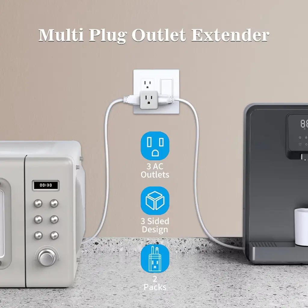 Itopfox 3 Outlet Wall Adapter, Multi Plug Outlet Extender With 3 Prong Grounded Plug, Power Plug Expander For Home And Office, White, 2-pack