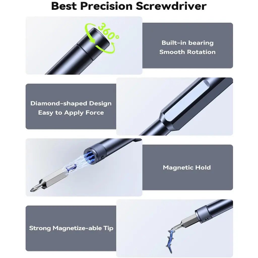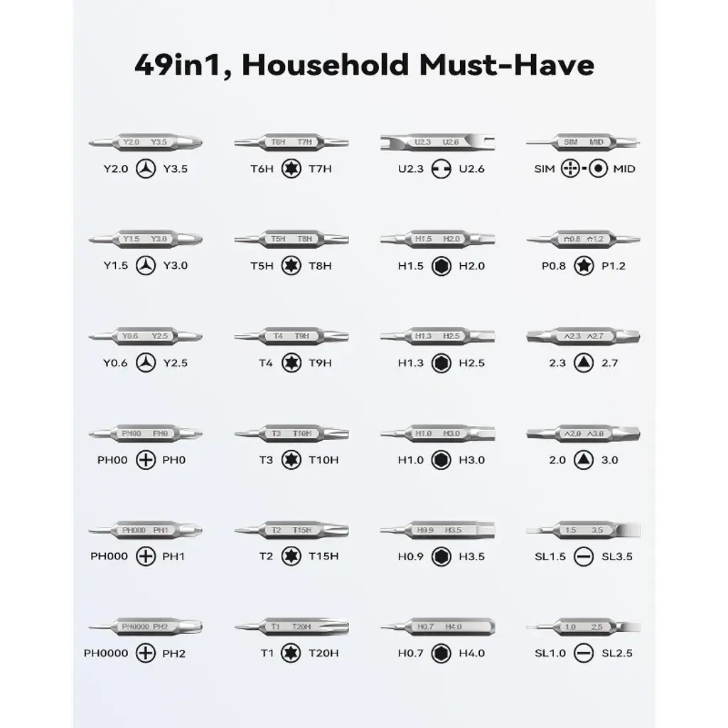Discover this 49 - in - 1 small screwdriver set, a must - have for both professional fixers and home repair hobbyists. It features 49 different bits in a double - sided design, including Phillips, Flat, Torx and more. Made of high - quality bearing steel, the bits have a hardness over HRC65°, offering excellent resistance to abrasion, oxidation and corrosion. The magnetized tip makes handling tiny screws a breeze. The ergonomic design includes a smooth swivel cap and a unique diamond - shaped full - metal handle for easy operation. It's not only suitable for disassembling, repairing and reassembling phones, game consoles, wearables, laptops and tablets, but also fits all Ring Doorbell models for tasks like security removal and wifi password reset. The set comes in a small, sturdy case with a stay - shut latch and a bit tip pattern for easy access. This tool set is also an outstanding gift option for various festivals, bringing convenience to your daily repair needs.