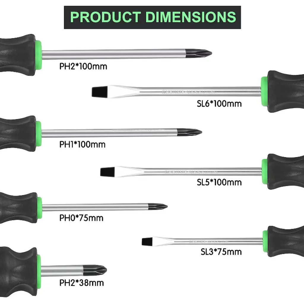 Discover our 7 - piece magnetic screwdriver set, a must - have for any toolbox. Crafted from high - quality chrome vanadium steel with heat treatment, these screwdrivers are built to last. They offer high hardness and large torque, ensuring a long service life. The ergonomic TPR handle with a button provides a comfortable grip and easy control, making it simple to use. The magnetic tips on the black - finish blades can conveniently attract screws, streamlining your work. With 4 Phillips and 3 flat - head screwdrivers, it covers a wide range of sizes for different tasks. Whether you're maintaining mechanical equipment, assembling domestic appliances, or working on furniture, this set is your ideal choice. It brings efficiency and convenience to your daily repairs and DIY projects.