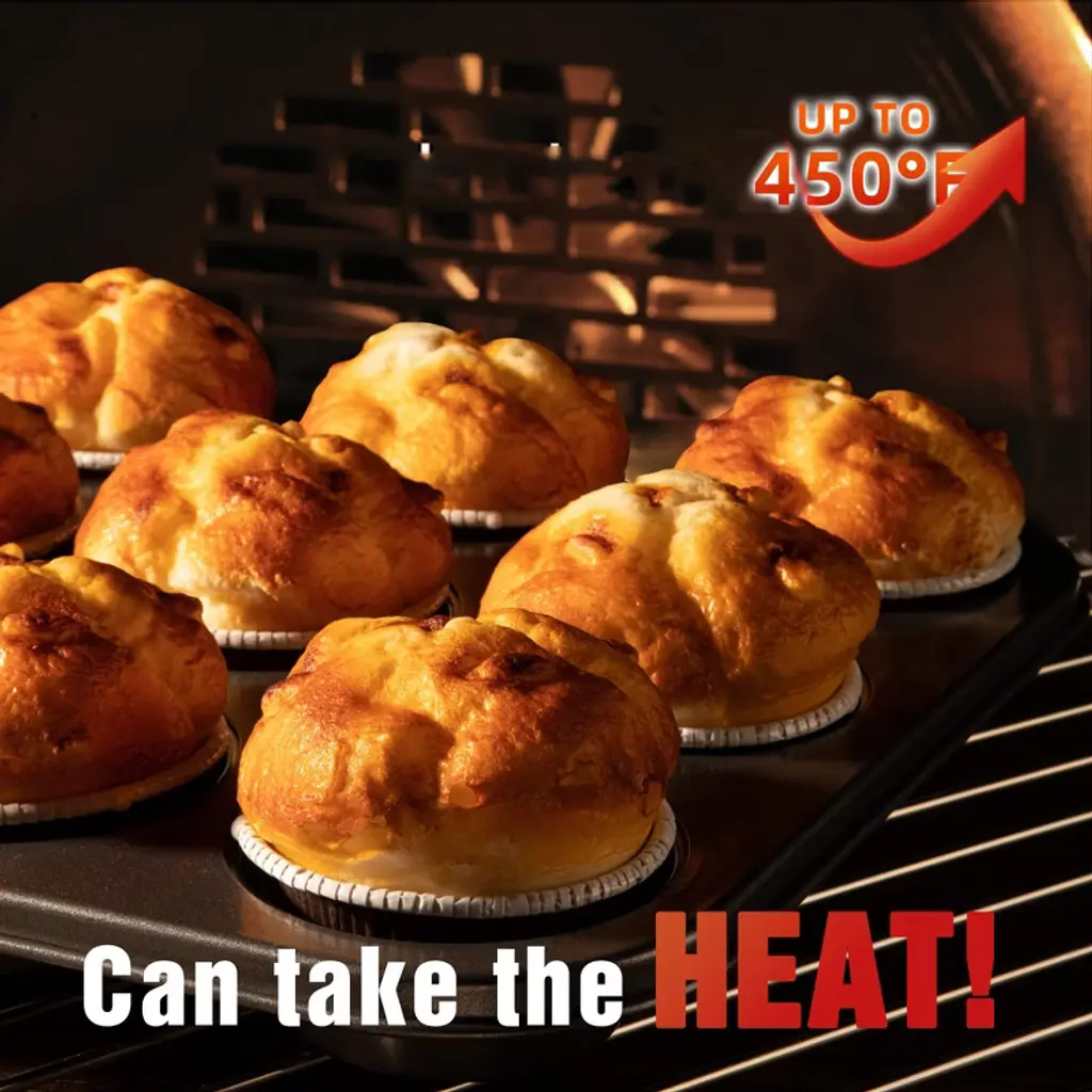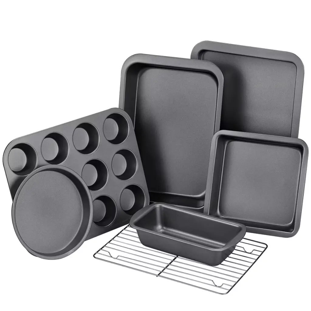 Elevate your baking game with this 7 - piece bakeware set. It includes a round cake pan, square cake pan, loaf pan, muffin pan, cookie sheet, cooling rack, and roast pan. The nonstick interior, with interlocking layers, guarantees easy food release and even heat distribution, ensuring your baked goods turn out perfectly every time. Crafted from high - quality carbon steel, it can withstand high temperatures up to 482 F, resists warping, rust, and scratches, and is built to last a lifetime. The stackable design, along with the cooling rack, saves valuable kitchen space. The set is lightweight, making it easy to handle. All pieces come neatly packed in one box, so you'll never have to search for a missing pan again. Whether you're a beginner or a seasoned chef, this set is perfect for all your baking needs, from making cakes and muffins to roasting meats. And with its dishwasher - safe feature, cleanup is a breeze. Start creating delicious treats today!