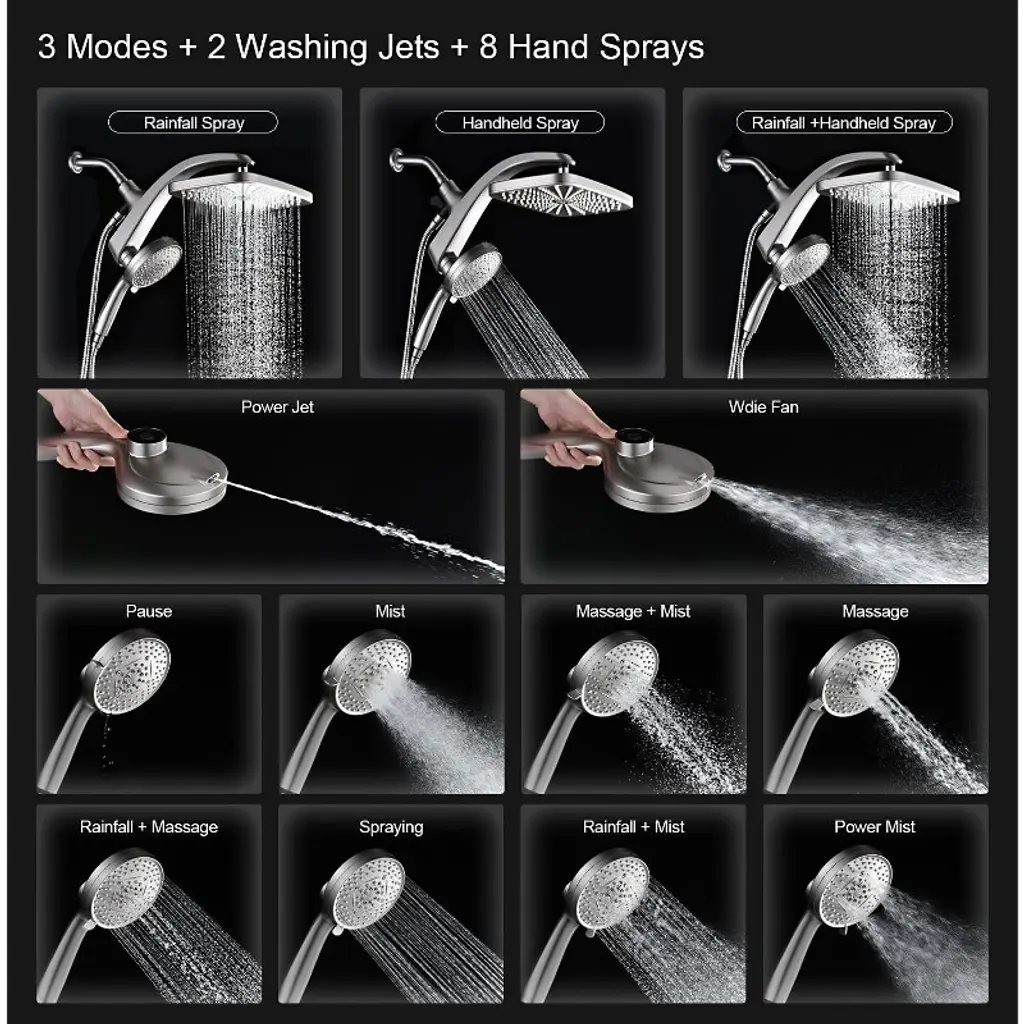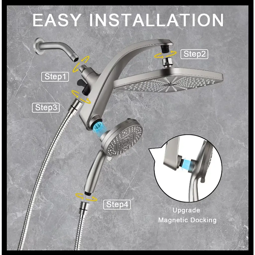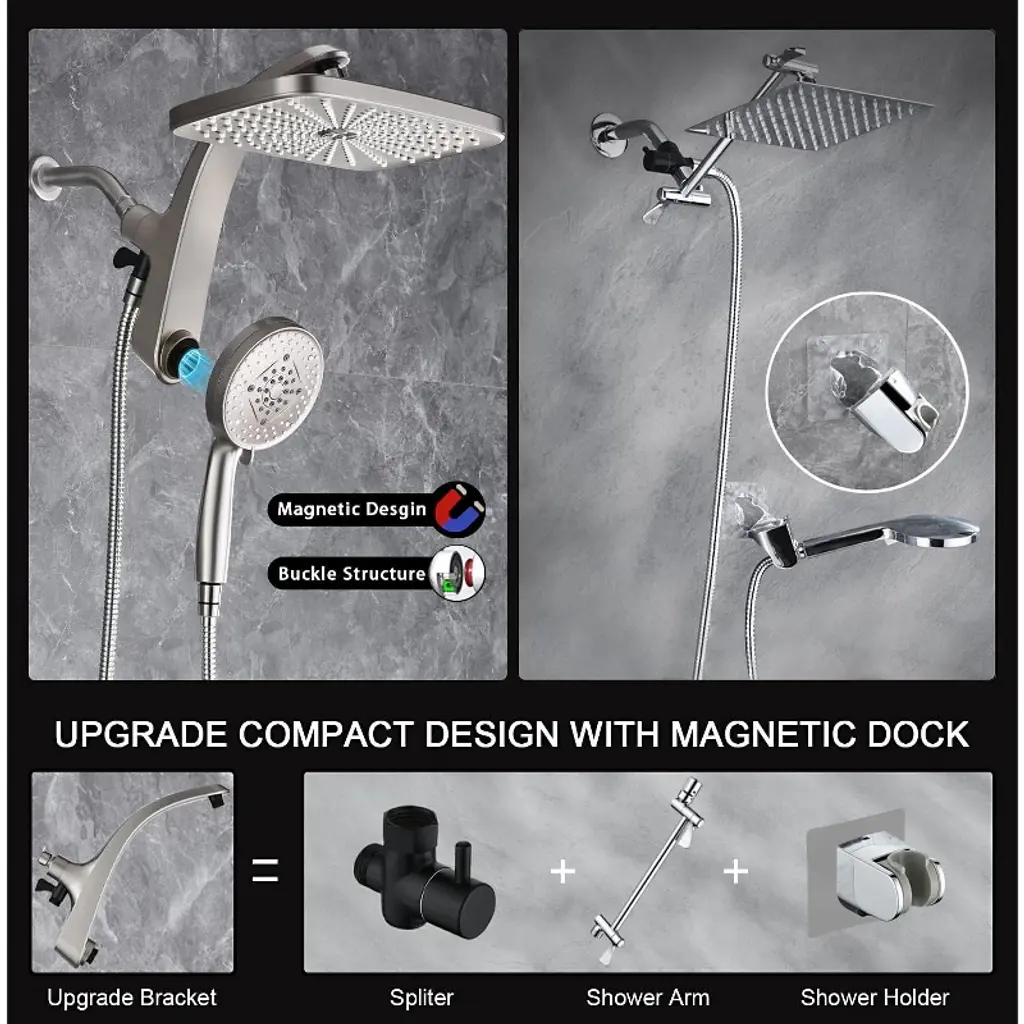Elevate your shower experience with this high - pressure rain shower head. It features an upgraded design with a fixed showerhead and a 10 - spray handheld shower head. The strong metal magnetic combin buckle structure ensures the handheld shower head stays firmly in place. With 278 spray nozzles, it provides a smooth, rain - like feeling, just like a rainforest shower at home. The 274 anti - clog nozzles and 4 big strong massage nozzles not only prevent blockages but also offer a great body massage. You can easily switch the water flow between the fixed and handheld shower heads by turning the black knob on the shower bracket, saving water and adding convenience. Whether you're taking a cozy shower, cleaning your pets, or washing your bathroom, this shower head is the perfect choice.
