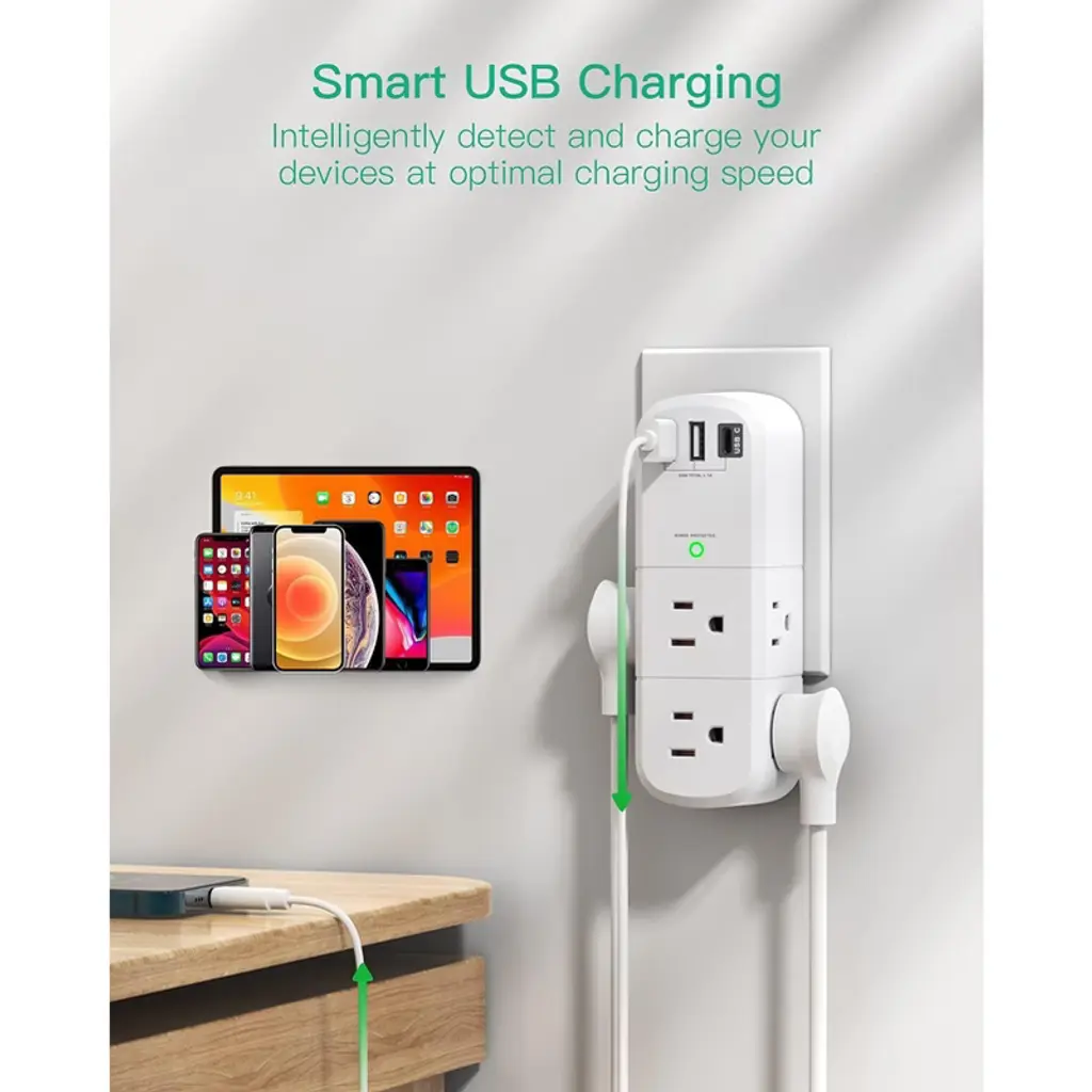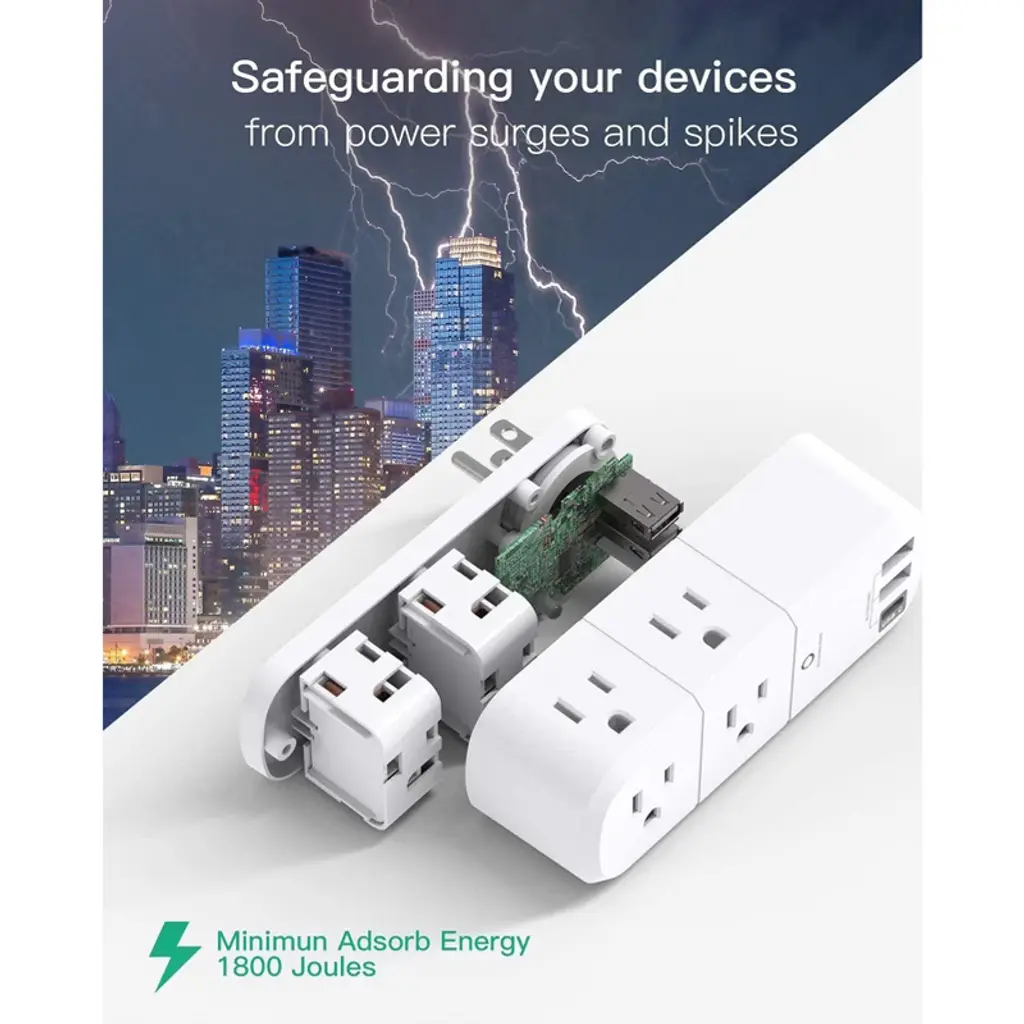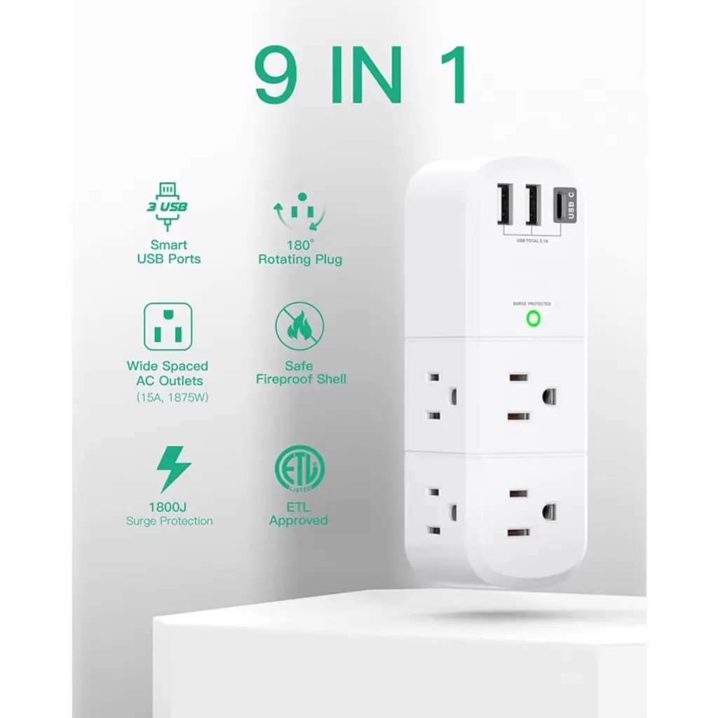 Upgrade your power management with this multi - functional outlet extender. It combines 6 AC outlets and 3 USB ports, including a USB - C port, delivering a total output of DC 5V/3.1A. The 1800 Joules surge protector, with 3 complementary circuits (TVS, MOV, GDT), offers rapid and reliable protection against electrical spikes. The USB ports, equipped with smart IC technology, automatically adjust the charging speed for different devices. The unique 3 - side design provides wide - spaced AC outlets, accommodating large plugs without interference. The 180 - degree rotating AC plug and 90 - degree swivel power strip offer flexible usage. Certified by ETL, it comes with a fire - resistant ABS shell, ensuring safety. Ideal for home, travel, or dorm rooms, it simplifies your charging needs and keeps your devices secure all the time.