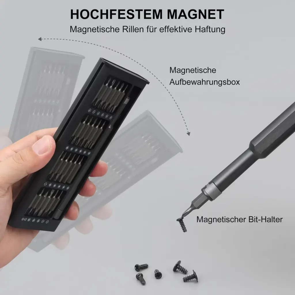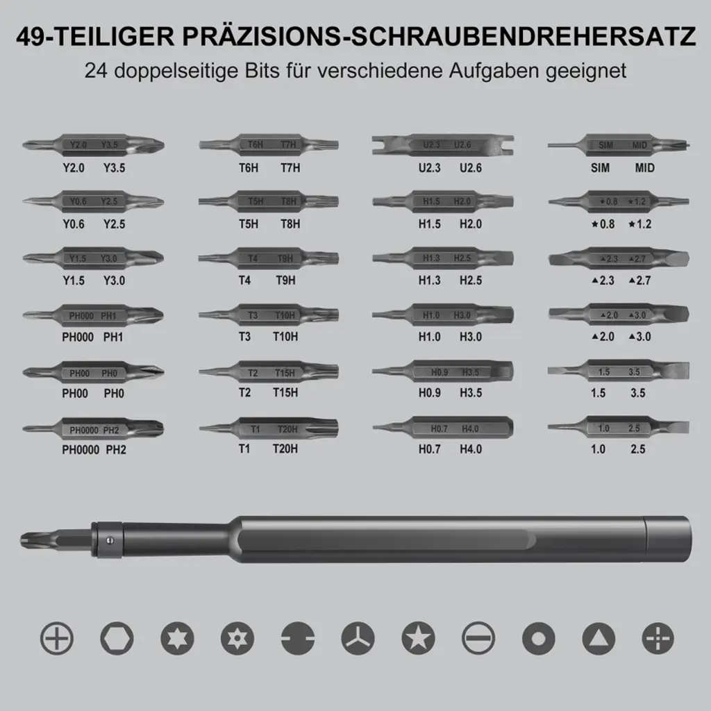 Discover this 49 - in - 1 precision screwdriver set, a must - have for all your repair needs. It features 24 double - end bits made of CRV steel, which are incredibly strong and long - lasting. The bit holder has a ball - bearing lock and a magnetic tip, ensuring bits stay in place and helping you handle tiny screws easily. The handle, made of durable aluminum alloy with a tri - lobe shape, provides a comfortable and non - slip grip, and the swivel cap allows for smooth screw turning. The set comes with a magnetic case for easy storage and portability. Whether you're an electronics fixer, PC builder, IT technician, or a DIY enthusiast, this set is perfect for repairing laptops, iPhones, cell phones, and many other devices. It brings great convenience to your repair work, making it a practical addition to your tool collection.