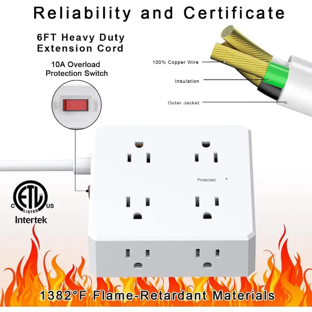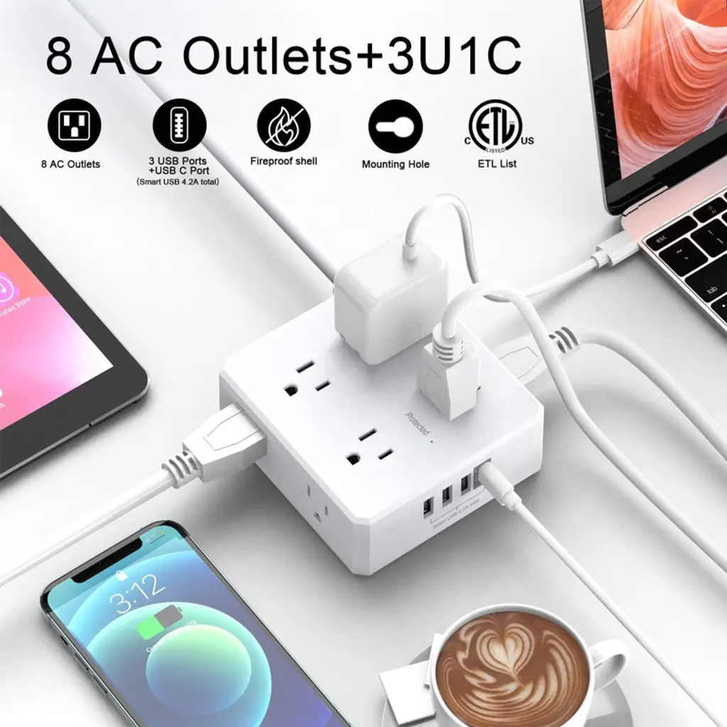 Upgrade your power - charging experience with this versatile power strip. It features 8 AC outlets and 4 USB ports (1 USB C), capable of powering up to 12 devices at once. The 3 - side design and wide - spaced outlets ensure that plugs don't cover each other, making it suitable for all types of equipment. With a 6 - foot right - angled flat plug power cord, it offers greater flexibility. The reusable cable ties help keep the cord organized. It comes with multi - safety protection, including overload, short - circuit, and over - voltage protection, and has a minimum energy - absorbing capacity of 900 Joules. The power strip holds RoHS, FCC, and ETL certificates, guaranteeing its safety and quality. Ideal for home, office, or dorm rooms, it simplifies your device charging and protects your electrical appliances from surges.