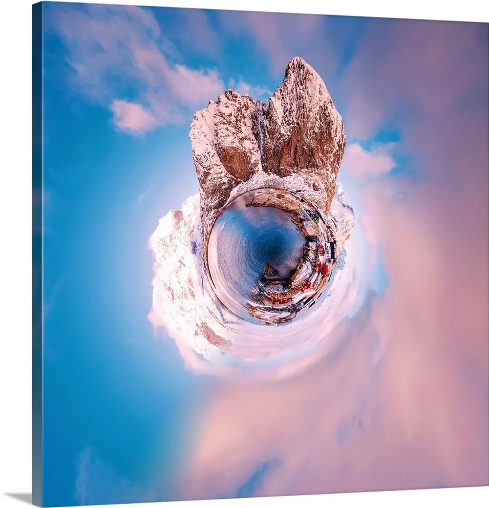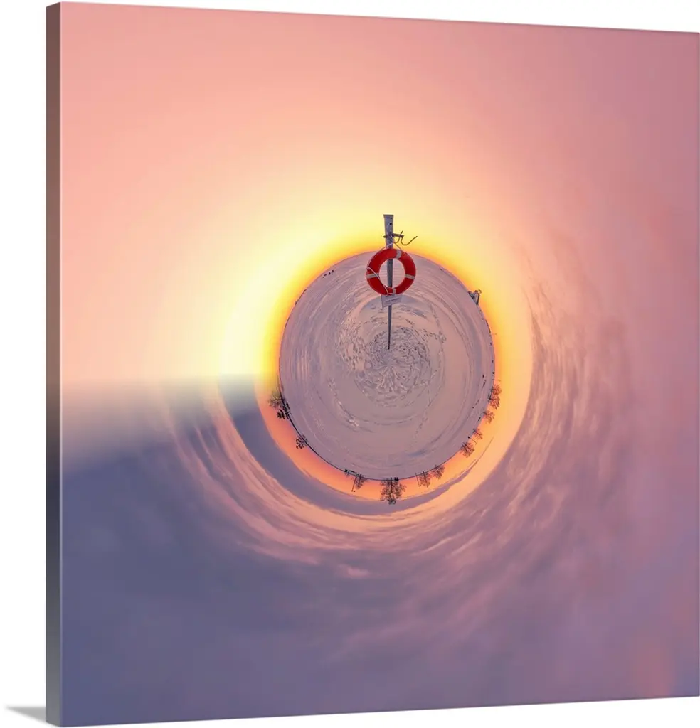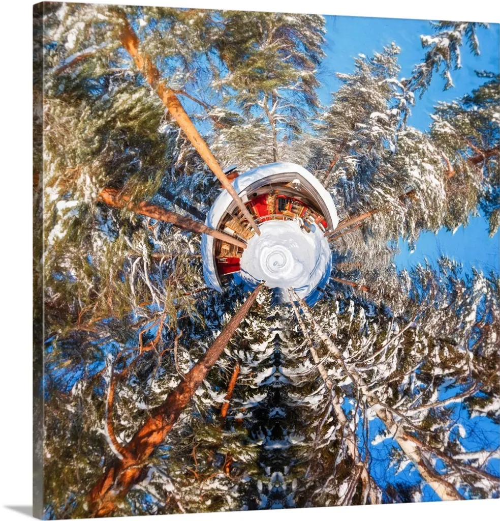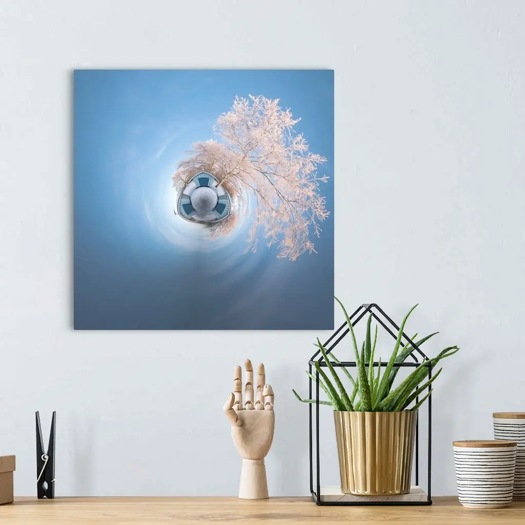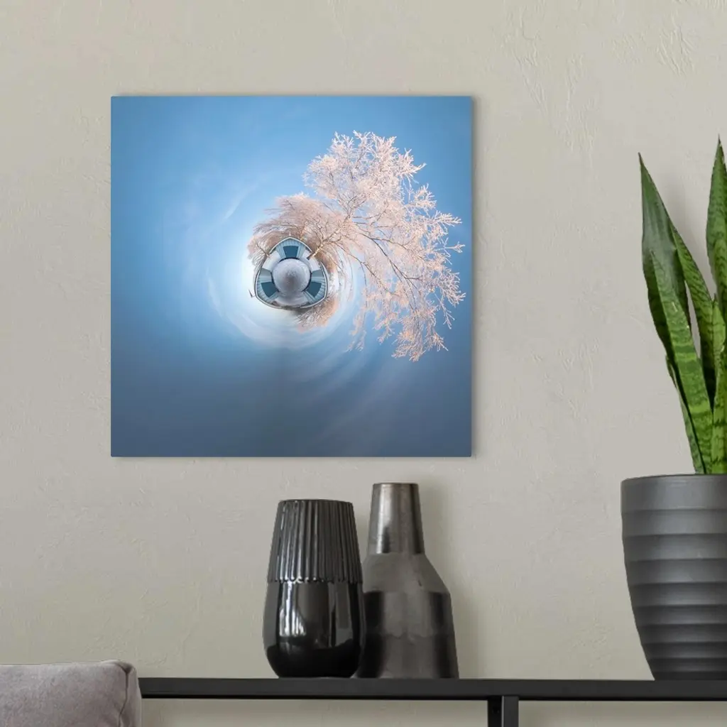 A tree covered in frost in the winter against a blue sky, with a stereographic projection effect on the image, resembling a tiny planet.