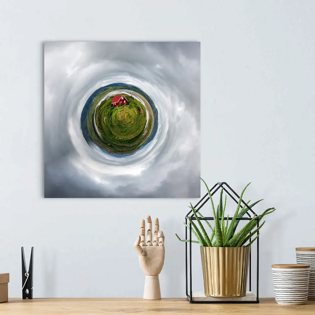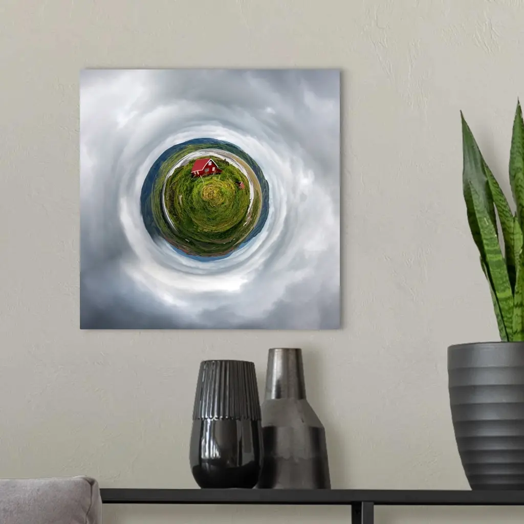 A red farmhouse in a lush green field under stormclouds, with a stereographic projection effect on the image, resembling a tiny planet.